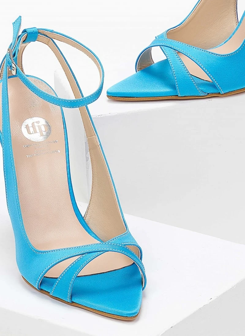 TFP μυτερά σατέν πέδιλα. Έχουν χιαστί λουράκια και δένουν στο ύψος του αστραγάλου. Δερμάτινος πάτος. Ελληνικής κατασκευής.