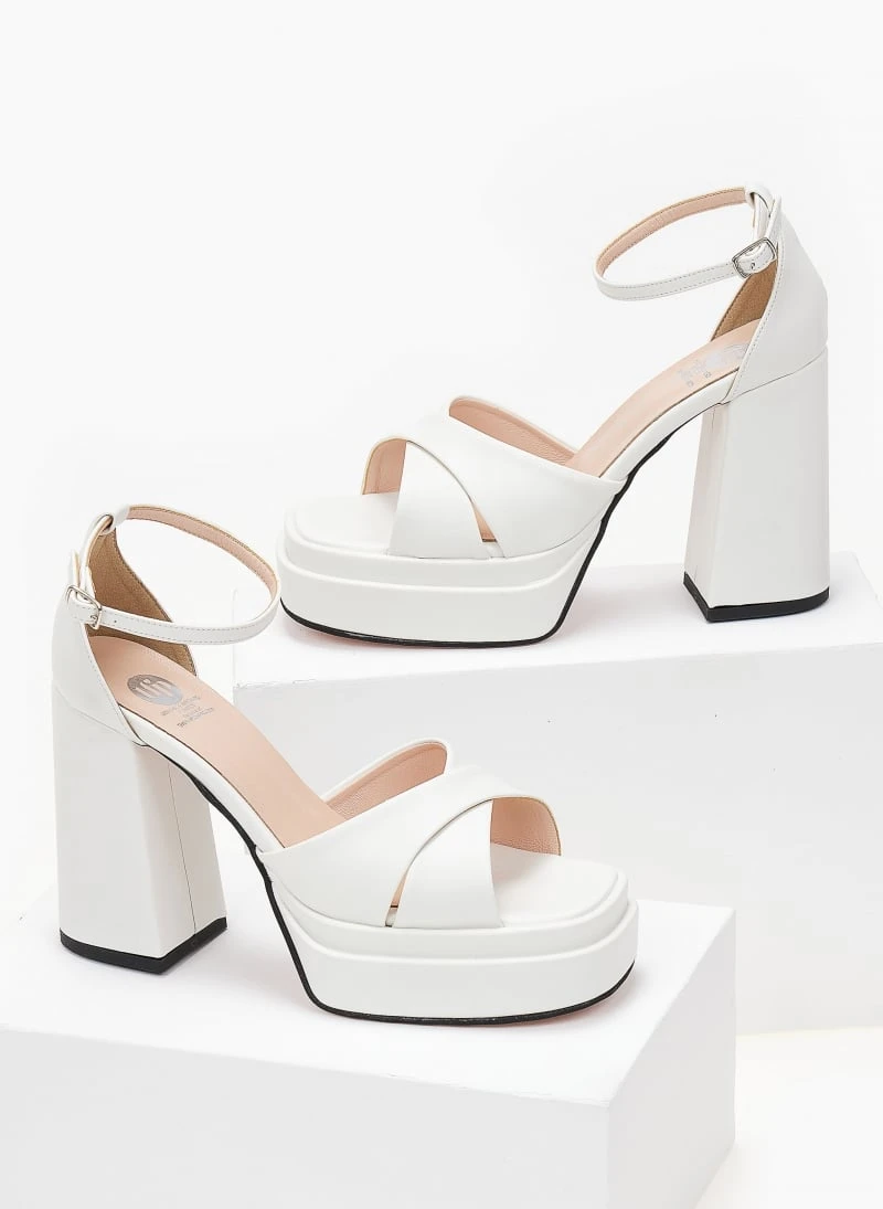 Πέδιλα TFP με χιαστί φάσες. Έχουν διπλή φιάπα και ψηλό χοντρό τακούνι. Δένουν με μπαρέτα στο ύψος του αστραγάλου. Κλειστή φτέρνα. Ελληνικής κατασκευής.