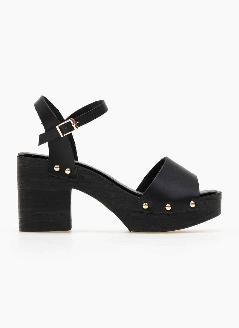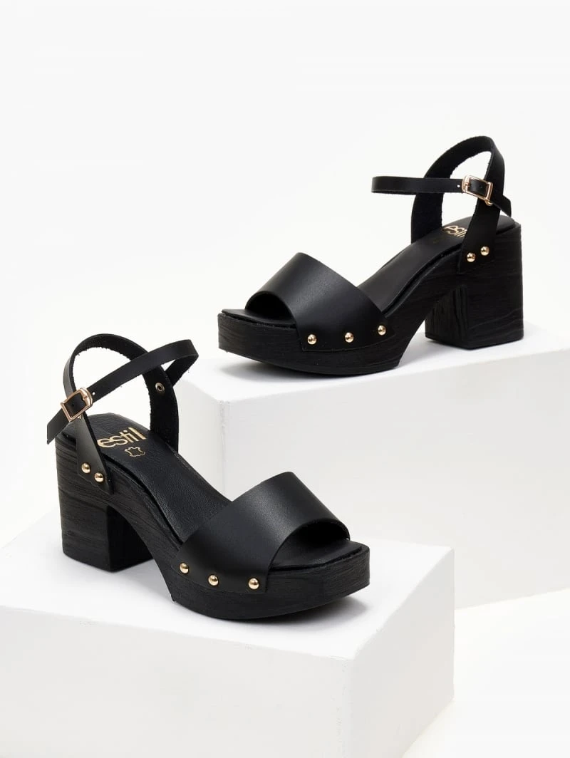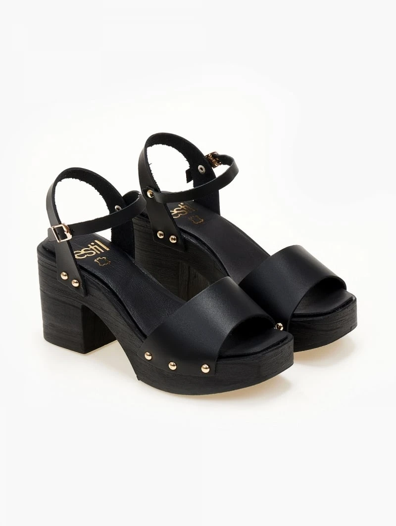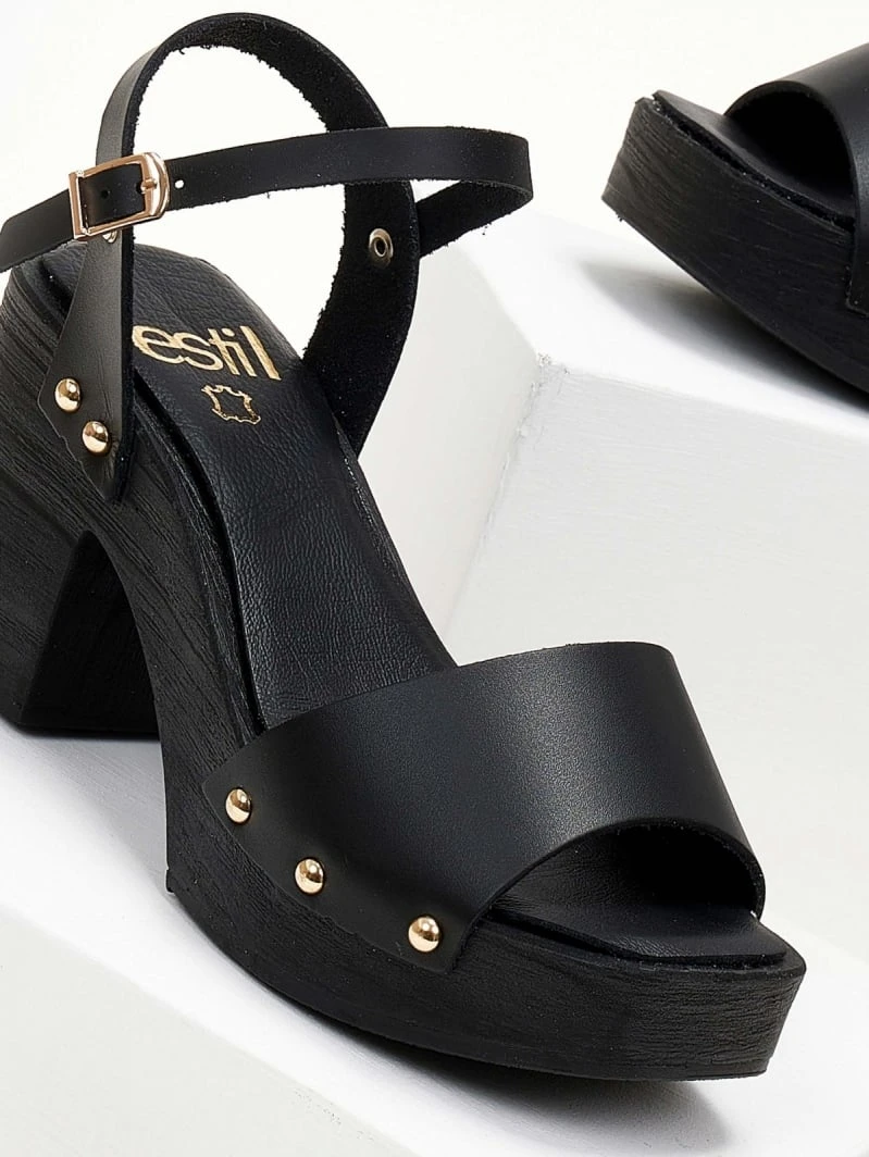 Πέδλα δερμάτινα Estil με ξύλινη σόλα. Έχουν δερμάτινο πάτο. Μεταλλικά τρουκς στο πλάι. Δένουν με μπαρέτα στο ύψος του αστραγάλου. Ελληνικής κατασκευής.
