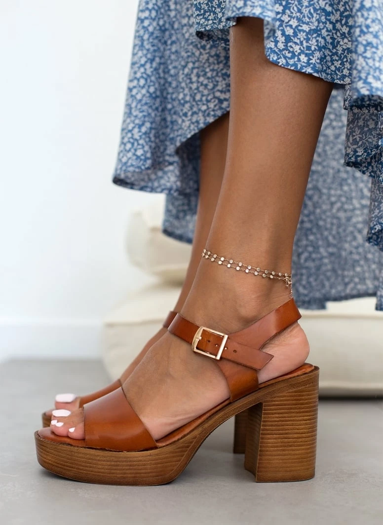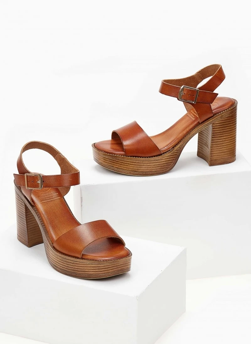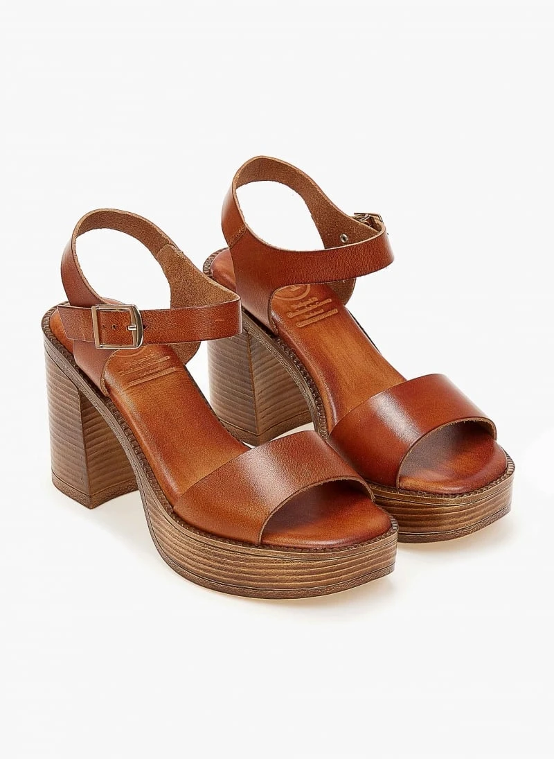 Δερμάτινα πέδιλα tfp με ψηλή φιάπα και χοντρό τακούνι. Έχουν φαρδιά φάσα. Δένουν στο πλάι με λουράκι. Ο πάτος έχει ενίσχυση. Ελληνικής κατασκευής.