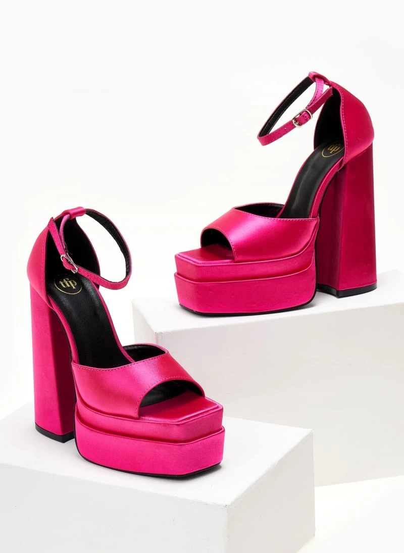 Πέδιλα platform σατέν TFP.Έχουν ψηλή φιάπα και χοντρό τακούνι. Κλειστή φτέρνα. Δένουν με μπαρέτα στο ύψος του αστραγάλου. Καρέ γραμμή.