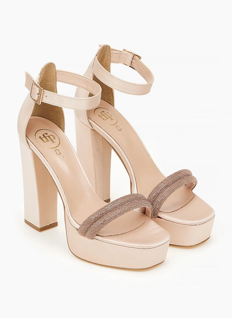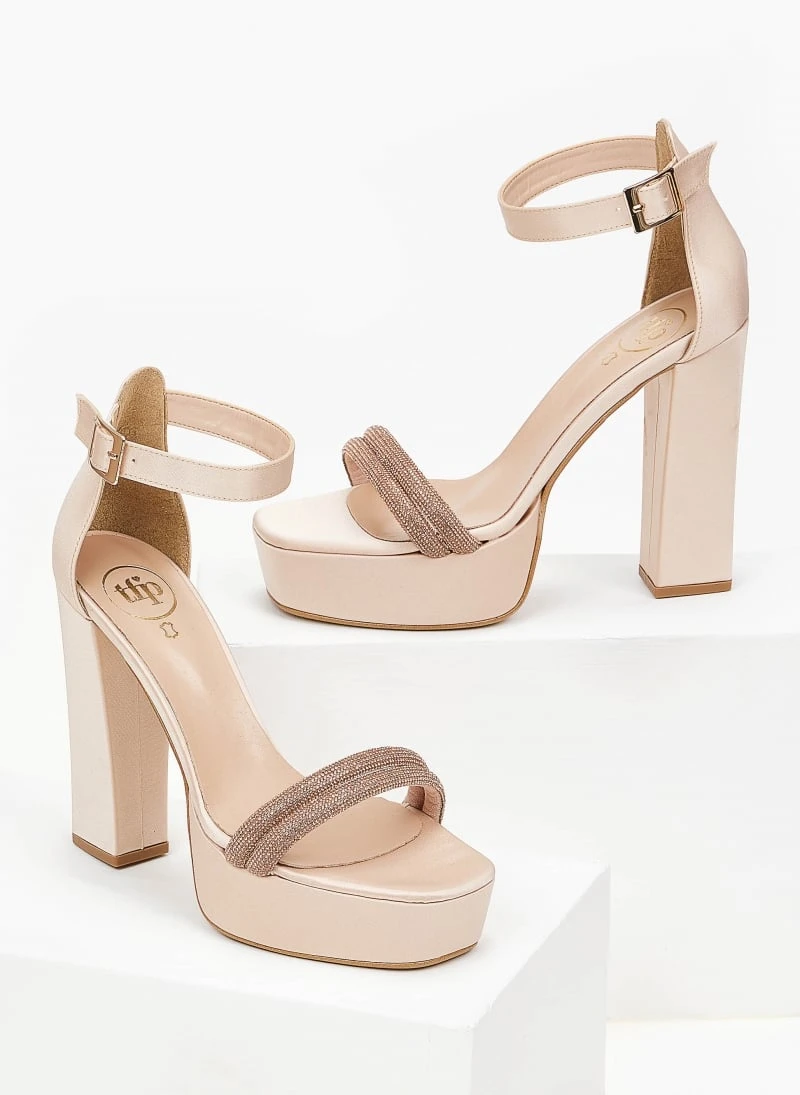 Πέδιλα σατέν TFP με φιάπα και ψηλό τετράγωνο τακούνι. Έχουν διπλό λουράκι με strass. H φτέρνα είναι κλειστή. Δένουν με μπαρέτα στο ύψος του αστραγάλου. Δερμάτινος πάτος. Ελληνικής κατασκευής.
