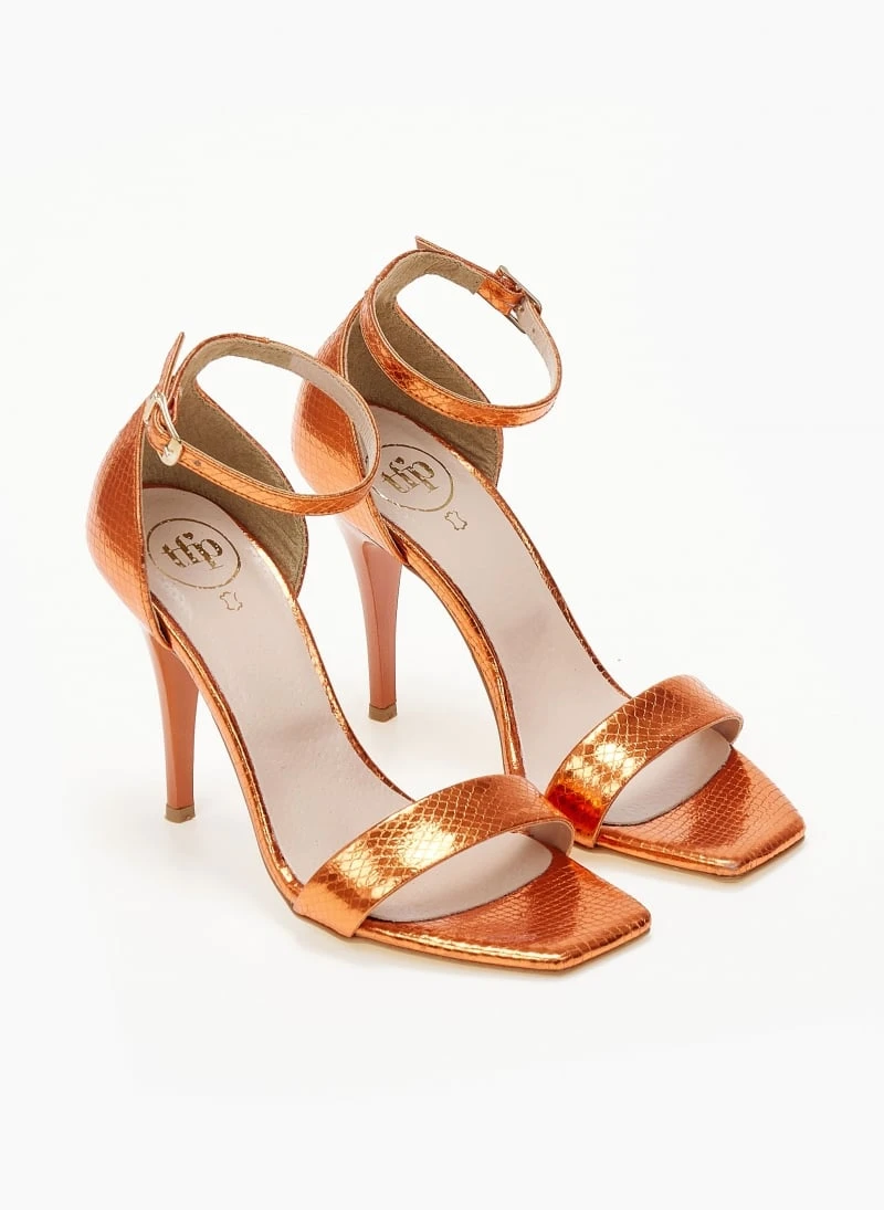 Πέδιλα TFP με pattern φίδι. Έχουν κλειστή φτέρνα. Δένουν με μπαρέτα στο ύψος του αστραγάλου. Δερμάτινος πάτος. Ελληνικής κατασκευής.