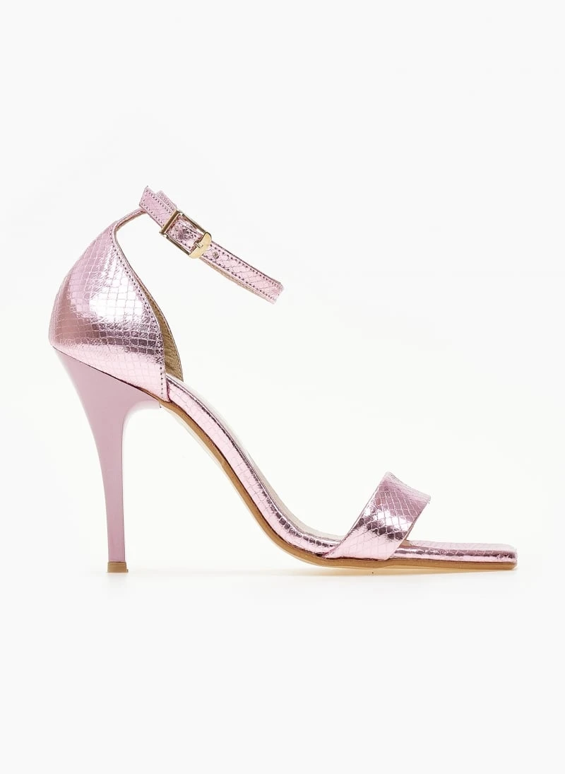 Πέδιλα TFP με pattern φίδι. Έχουν κλειστή φτέρνα. Δένουν με μπαρέτα στο ύψος του αστραγάλου. Δερμάτινος πάτος. Ελληνικής κατασκευής.