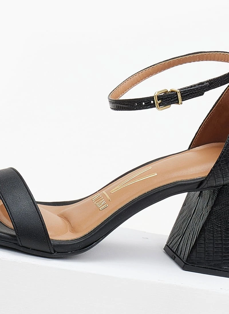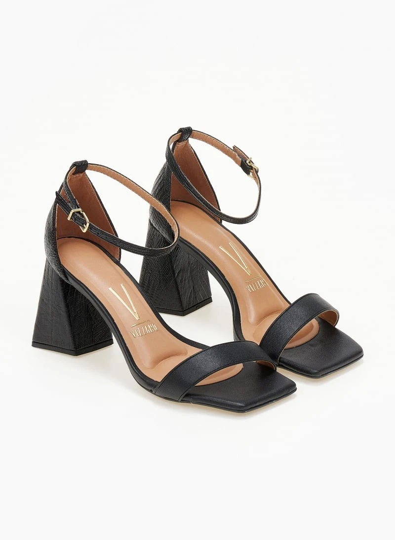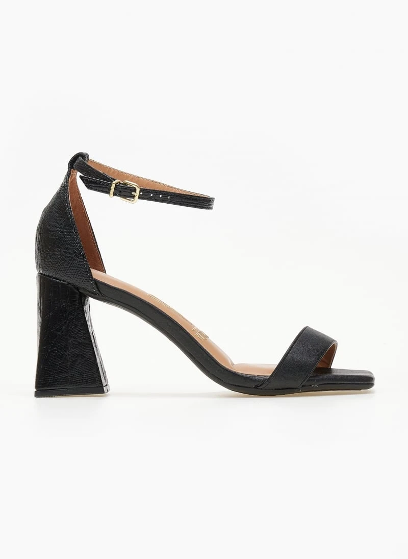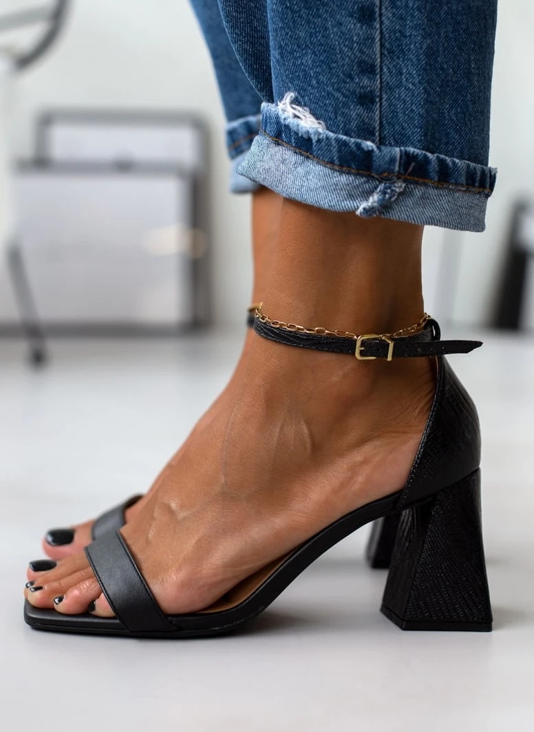 Πέδιλα σε καρέ γραμμή με λεπτή φάσα. Έχουν ανάγλυφο pattern στο πίσω μέρος και το τακούνι. Κλειστή φτέρνα. Δένουν με μπαρέτα στο ύψος του αστραγάλου. Διαθέτουν ενίσχυση με μαξιλαράκι στον πάτο.