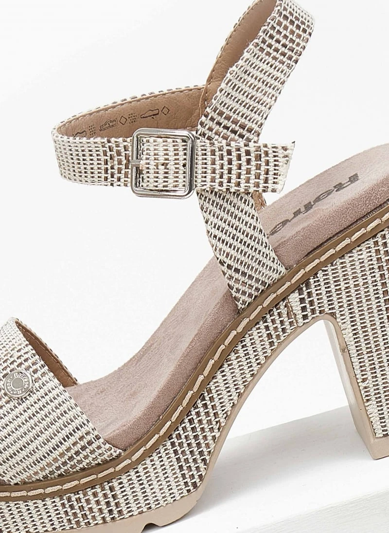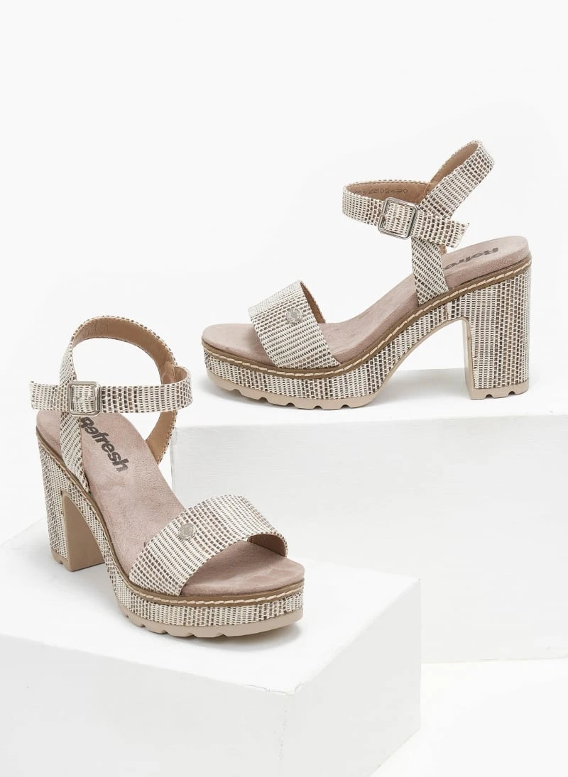 Πέδιλα Refresh. Έχουν πλεκτό σχέδιο ψάθα. Δένουν με μπαρέτα στο ύψος του αστραγάλου. Διακριτικό μεταλλικό στοιχείο στη φάσα. Ψηλό χοντρό τακούνι. Πάτος από suede. Peta vegan approved.