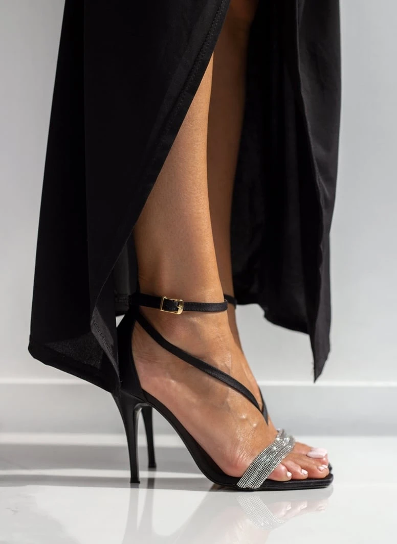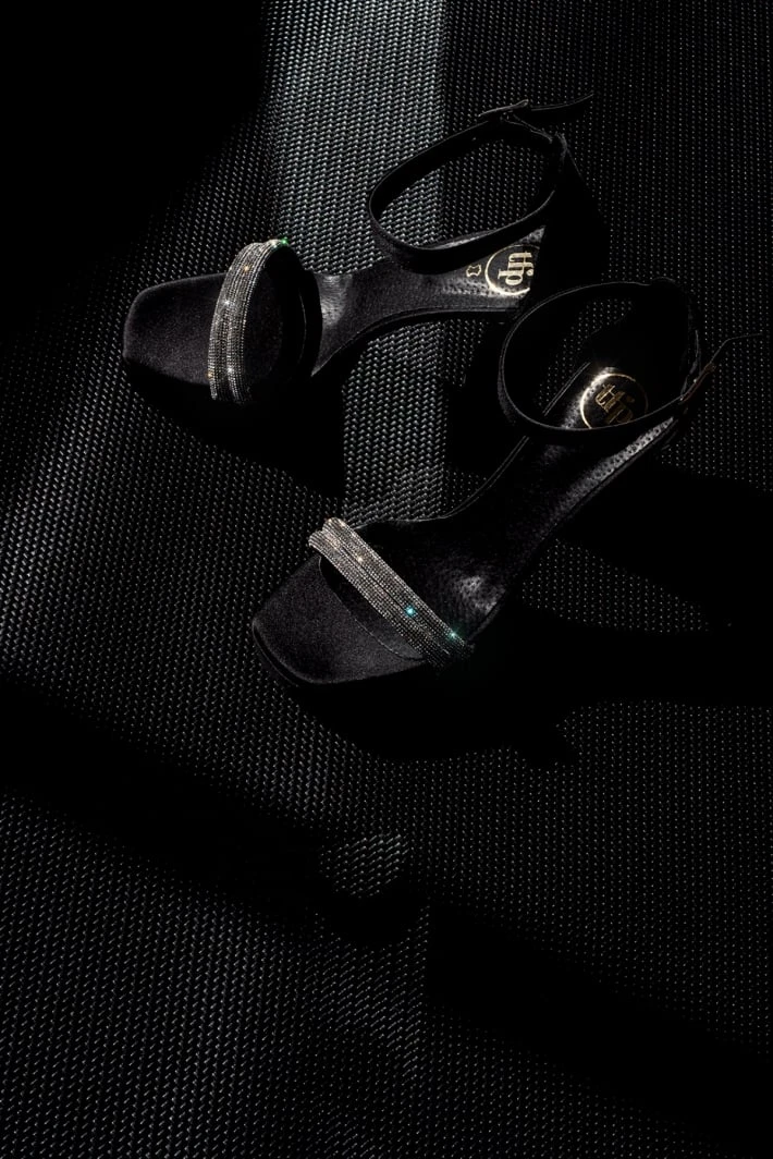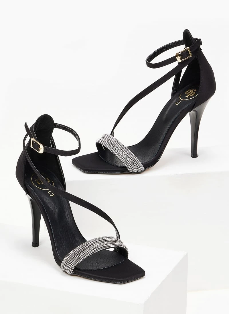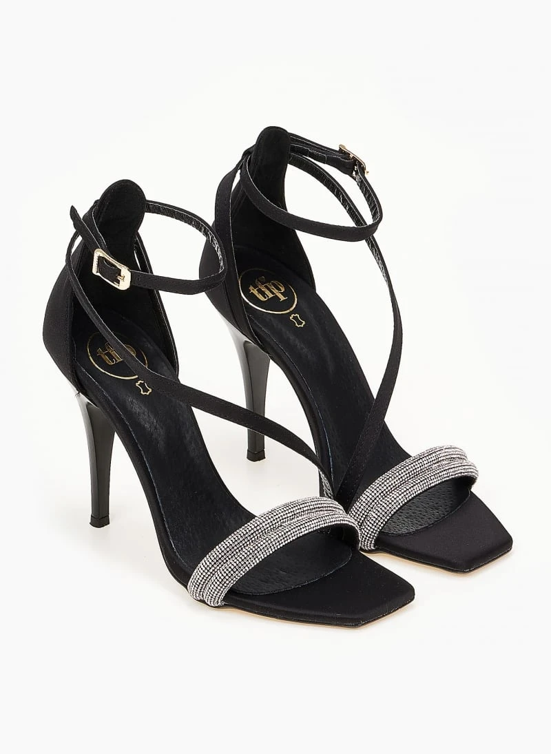 Πέδιλα σατέν TFP με διπλή σειρά strass. Έχουν κλειστή φτέρνα και ψηλό τακούνι. Δένουν με μπαρέτα στο ύψος του αστραγάλου. Καρέ γραμμή. Δερμάτινος πάτος. Ελληνικής κατασκευής.