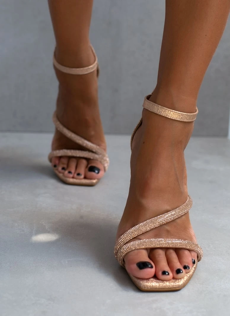 Πέδιλα TFP με ψηλό λεπτό τακούνι. Έχουν strass λουράκια. Κλειστή φτέρνα. Δένουν με μπαρέτα στο ύψος του αστραγάλου. Δερμάτινος πάτος. Καρέ γραμμή. Ελληνικής κατασκευής.
