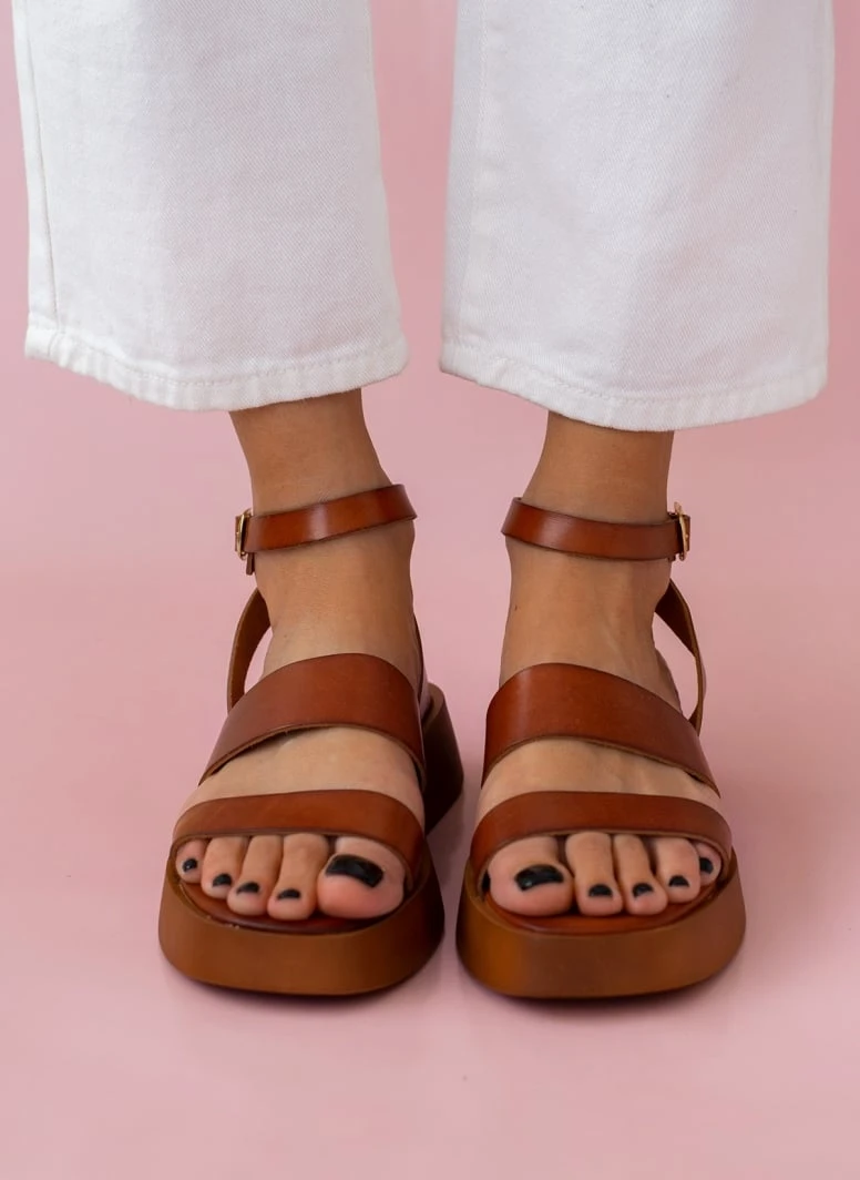 Σανδάλια δερμάτινα TFP με φάσες και ψηλή σόλα. Δένουν με μπαρέτα στο ύψος του αστραγάλου. Έχουν μαλακό δερμάτινο πάτο με ενίσχυση. Ελληνικής κατασκευής.