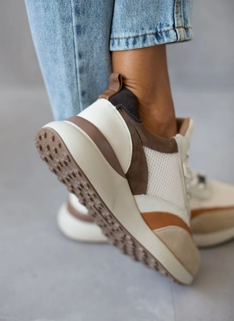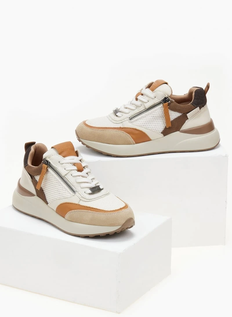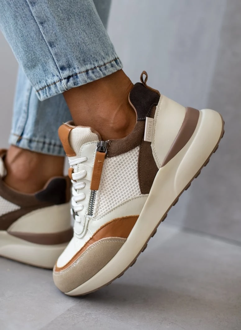 Sneakers δερμάτινα CARMELA με λεπτομέρειες από ύφασμα. Έχουν φερμουάρ στην εξωτερική τους πλευρά. Δερμάτινος πάτος.