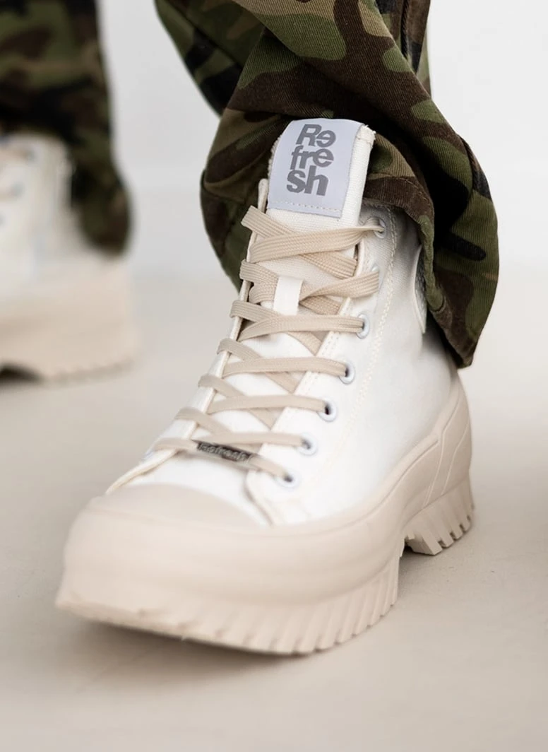 Sneakers μποτάκια πάνινα Refresh με ψηλή chunky σόλα. Διακριτικό λογότυπο στο πλάι. Έχουν φερμουάρ στην εσωτερική τους πλευρά. Μεταλλική λεπτομέρεια στα κορδόνια. Peta vegan approved.