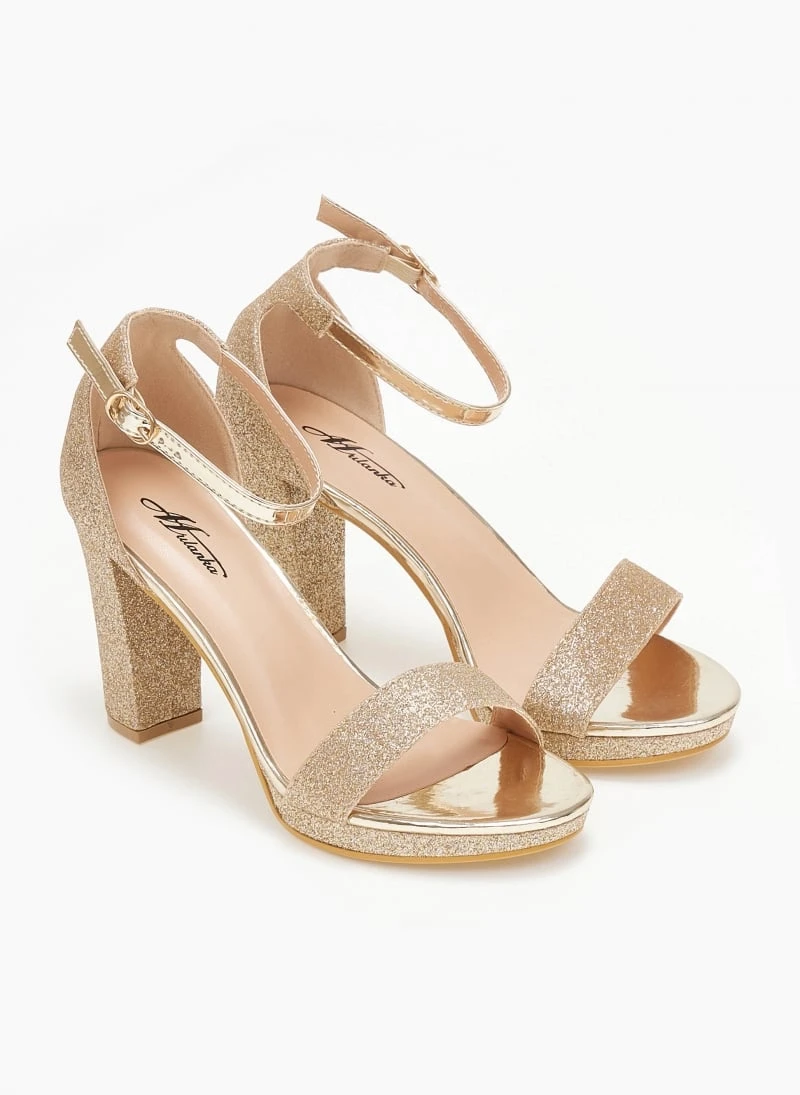 Πέδιλα με glitter. Έχουν λεπτή φάσα. Στρογγυλή γραμμή. Κλειστή φτέρνα. Δένουν με μπαρέτα στο ύψος του αστραγάλου.