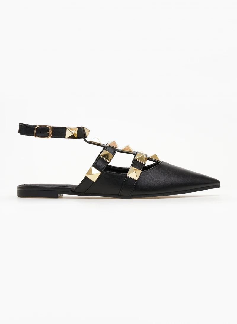 Μυτερές ανοιχτές μπαλαρίνες με μεταλλικά τρουκς. Δένουν με μπαρέτα στο ύψος του αστραγάλου.