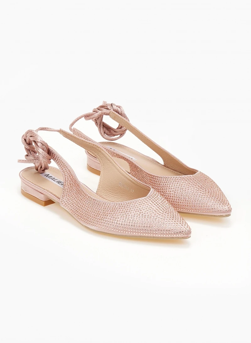 Μπαλαρίνες μυτερές σατέν με διακριτικά strass. Έχουν ανοιχτή φτέρνα. Lace up δέσιμο στη γάμπα.