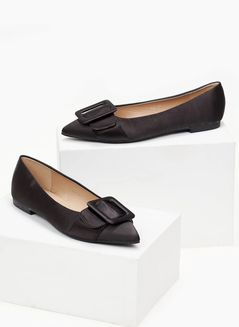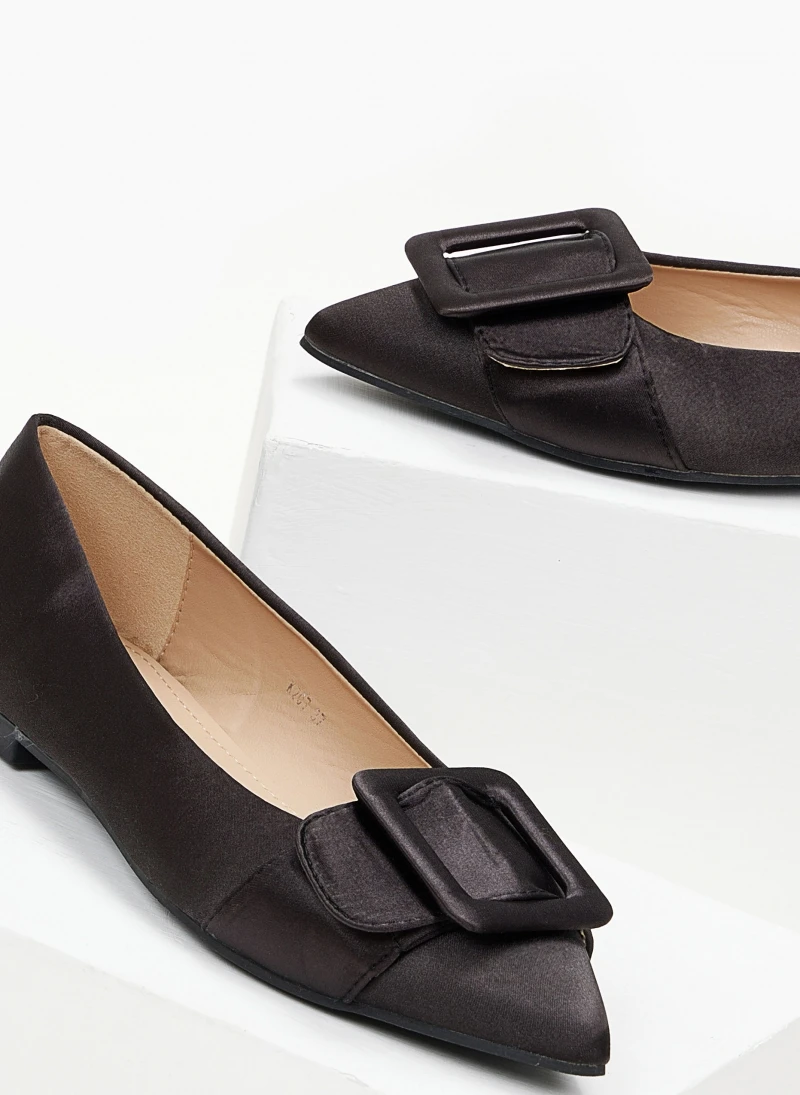 Μυτερές σατέν μπαλαρίνες χωρίς τακούνι.Έχουν ντυμένη τετράγωνη αγκράφα στο ίδιο χρώμα.