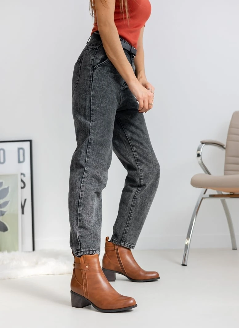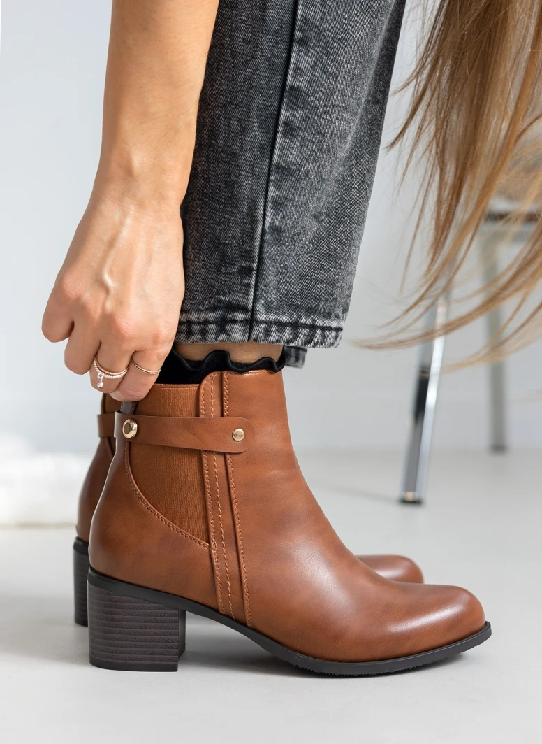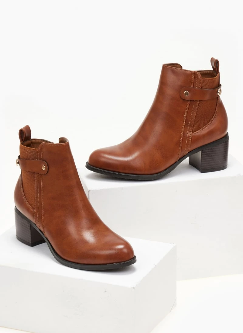Μποτάκια αστραγάλου σε στρογγυλή γραμμή και χαμηλό τακούνι. Έχουν ελαστικό τμήμα στην εξωτερική τους πλευρά και διακοσμητική μεταλλική λεπτομέρεια.