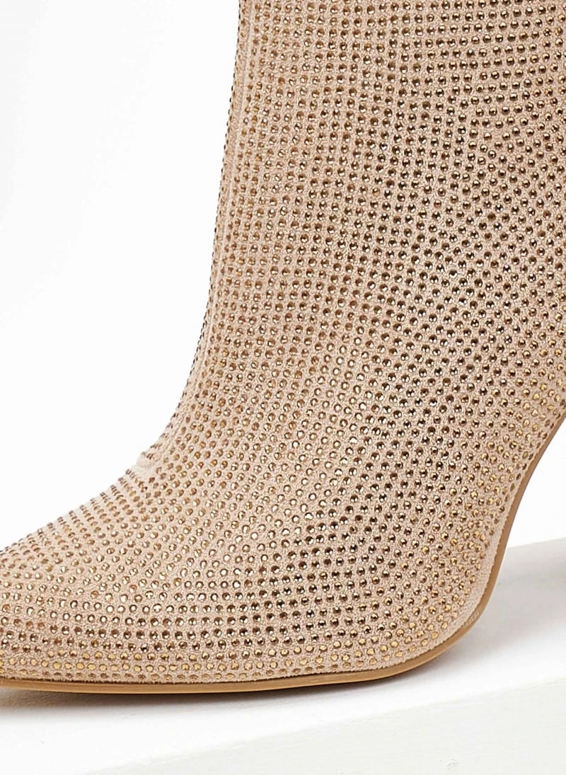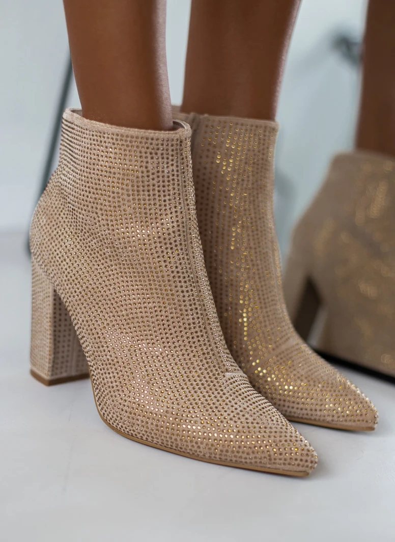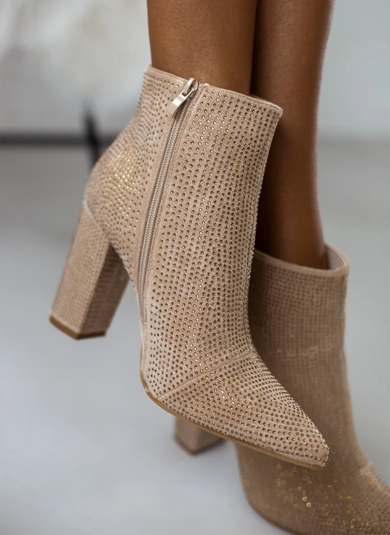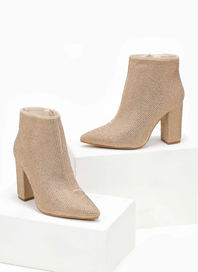 Μποτάκια αστραγάλου με strass. Έχουν ψηλό χοντρό τακούνι. Μυτερή φόρμα.