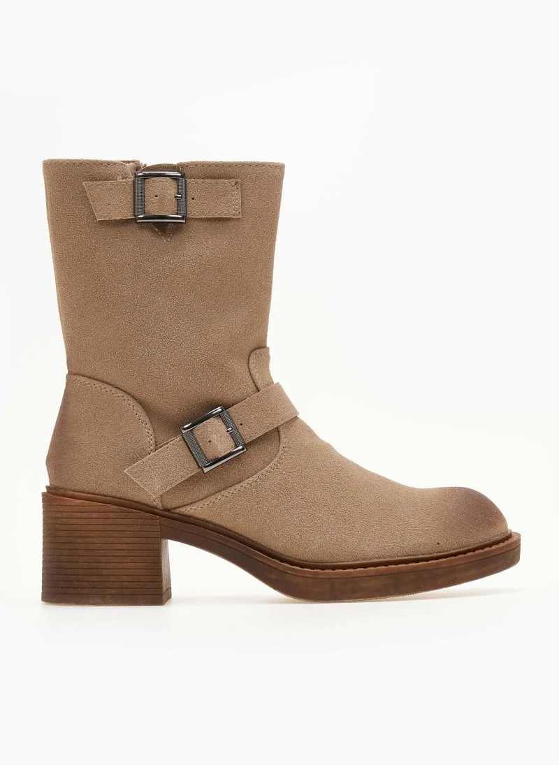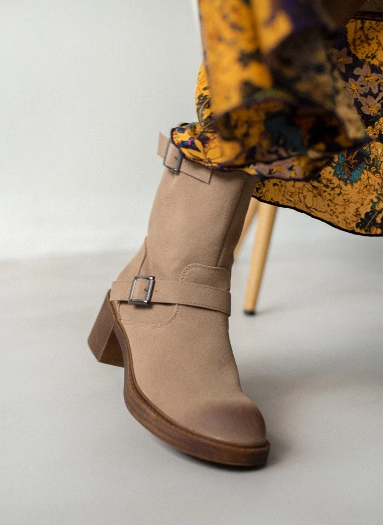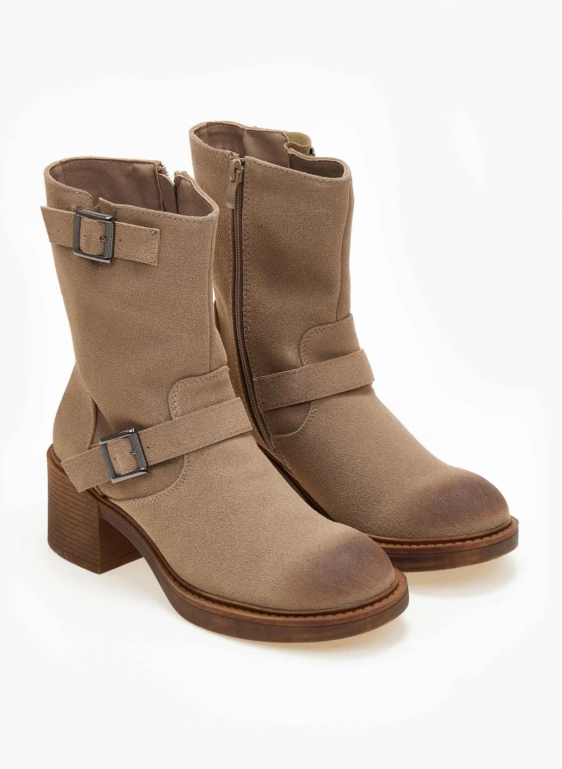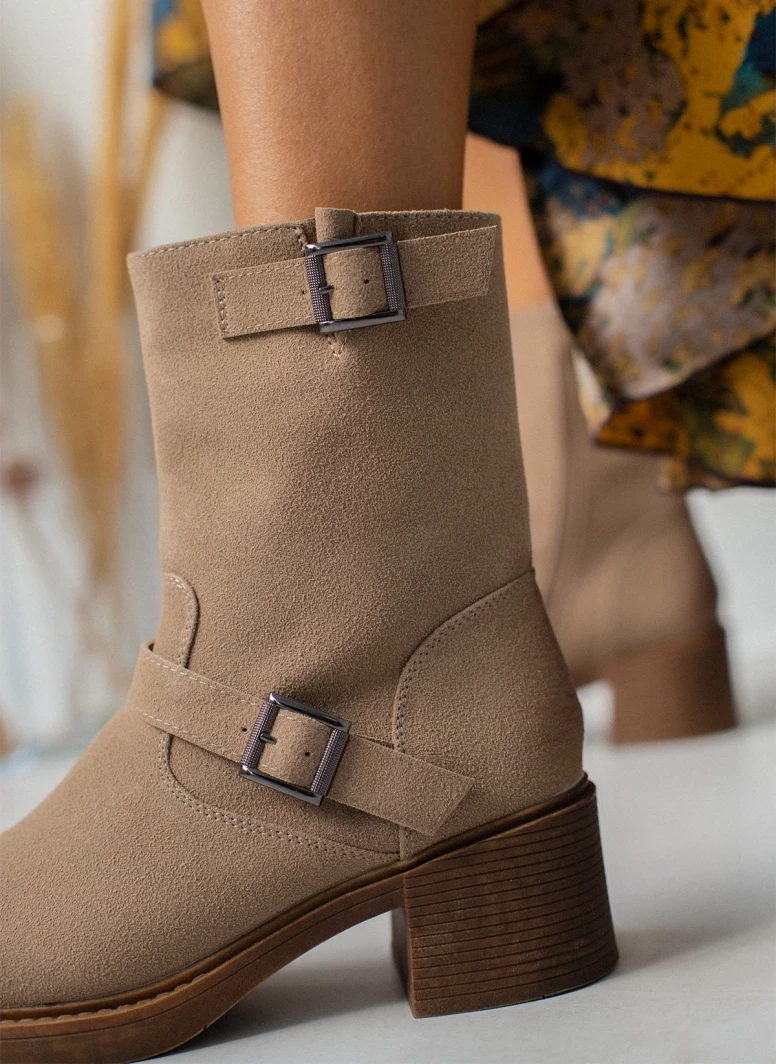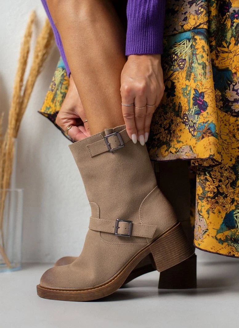 Μποτάκια biker με χοντρό τακούνι κρέπ . Έχουν διακοσμητικές αγκράφες στα πλαϊνά και κλείνουν με φερμουάρ. Στρογγυλή γραμμή.