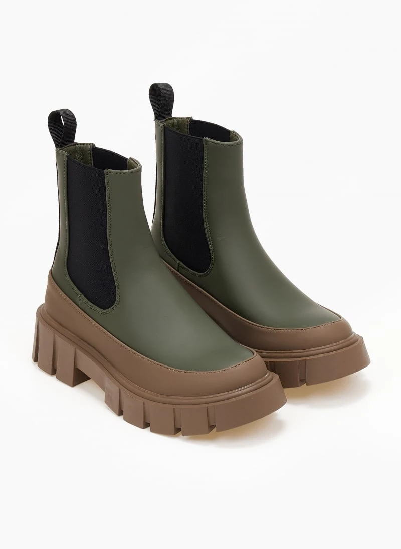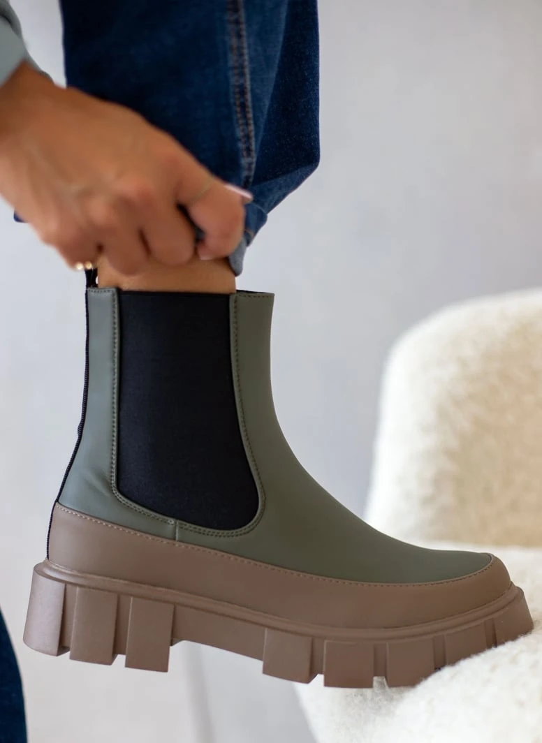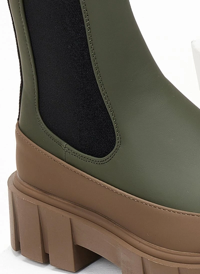 Μποτάκια chelsea με διχρωμία. Έχουν chunky σόλα. Λάστιχο στα πλαϊνά για καλύτερη εφαρμογή. Υφασμάτινη τρέσα με θηλάκι στο πίσω μέρος.