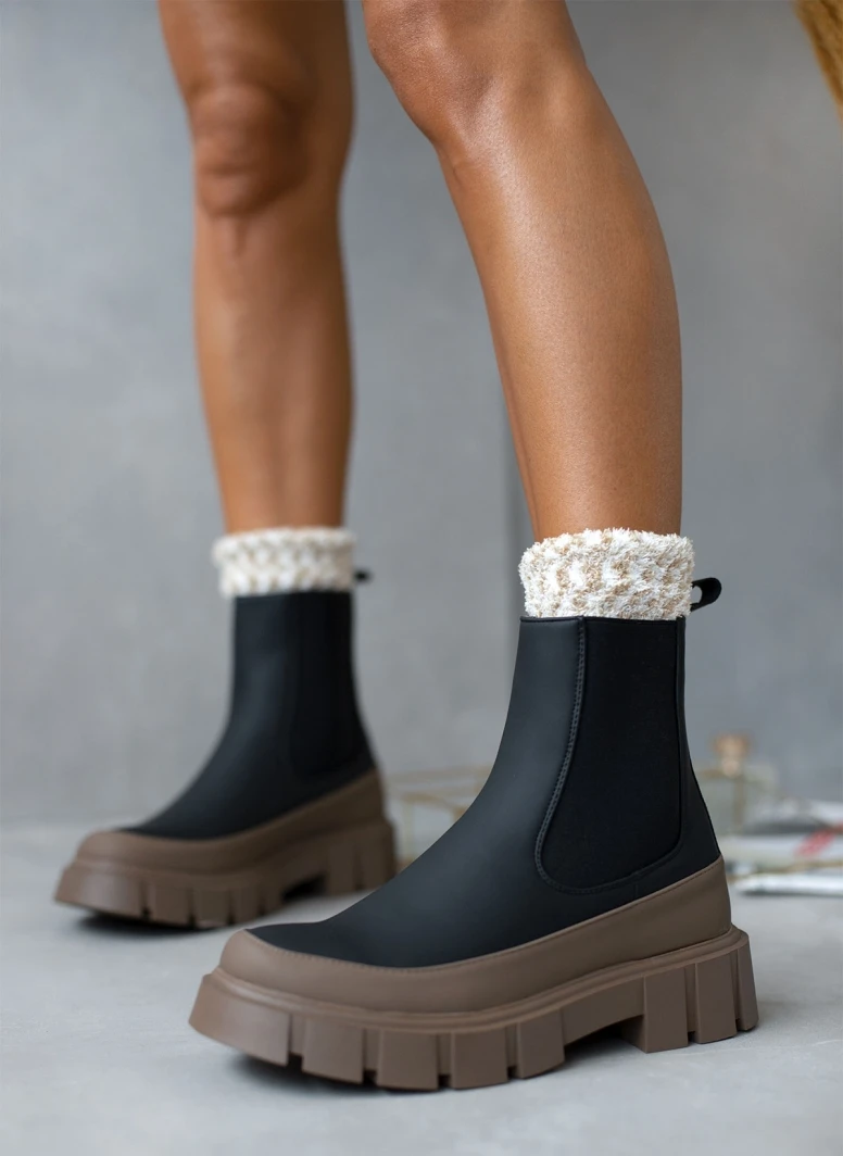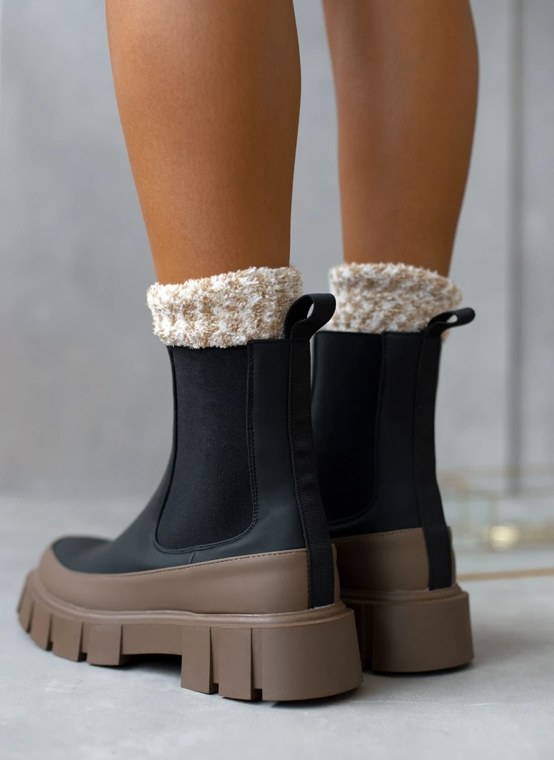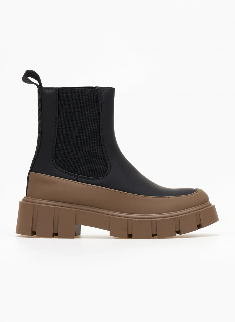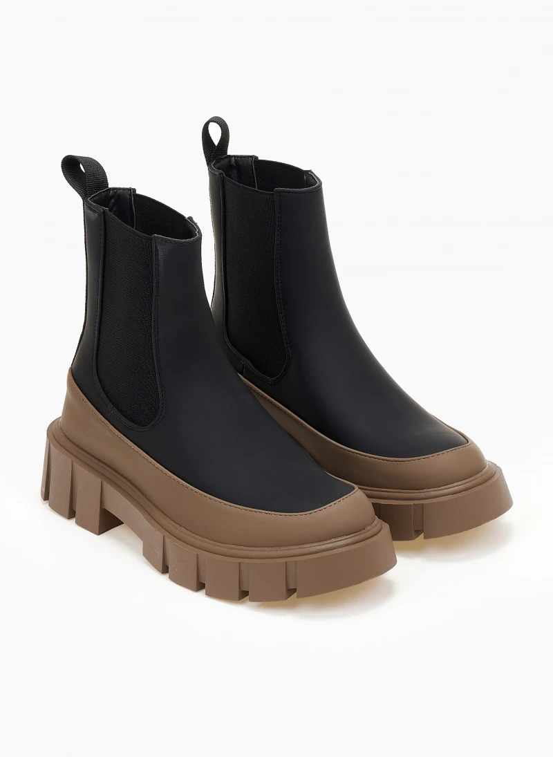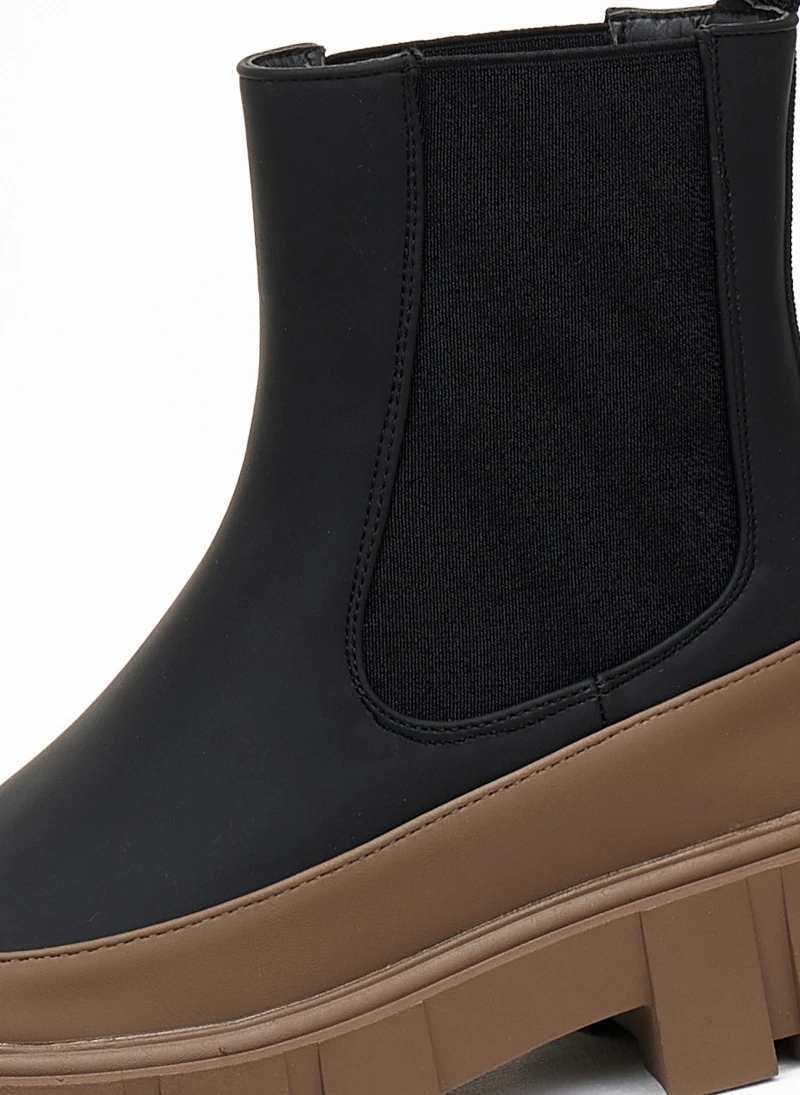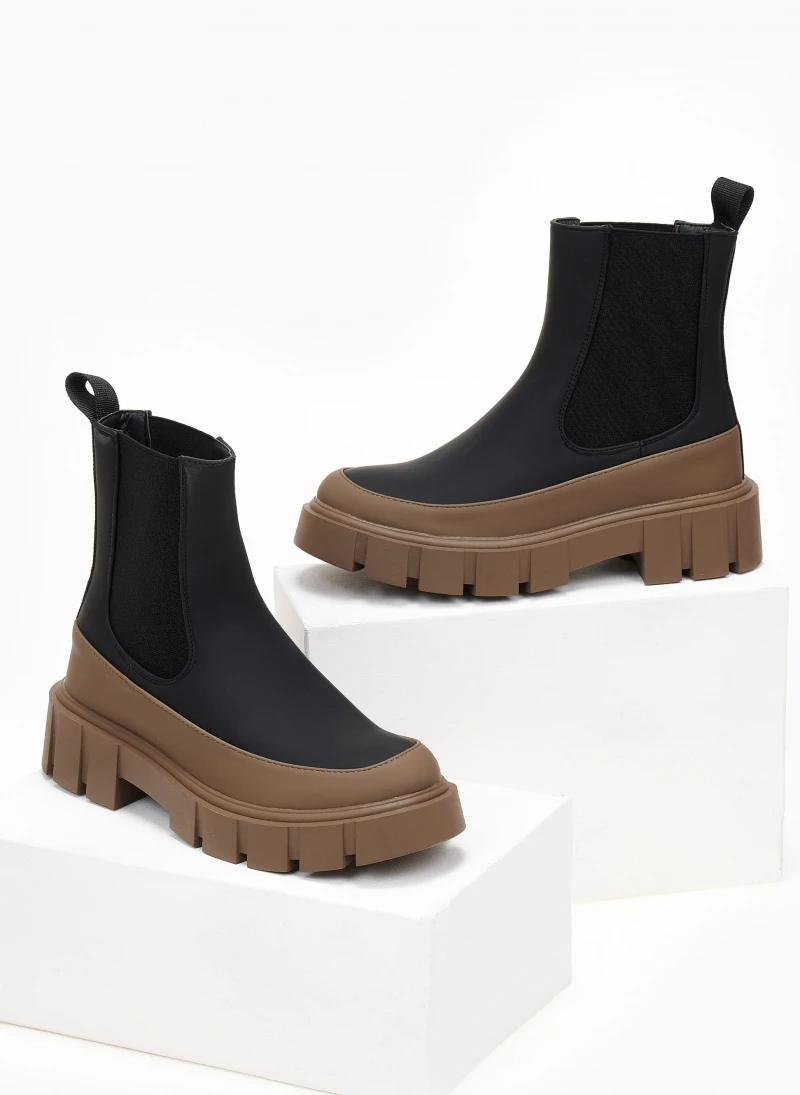 Μποτάκια chelsea με διχρωμία. Έχουν chunky σόλα. Λάστιχο στα πλαϊνά για καλύτερη εφαρμογή. Υφασμάτινη τρέσα με θηλάκι στο πίσω μέρος.