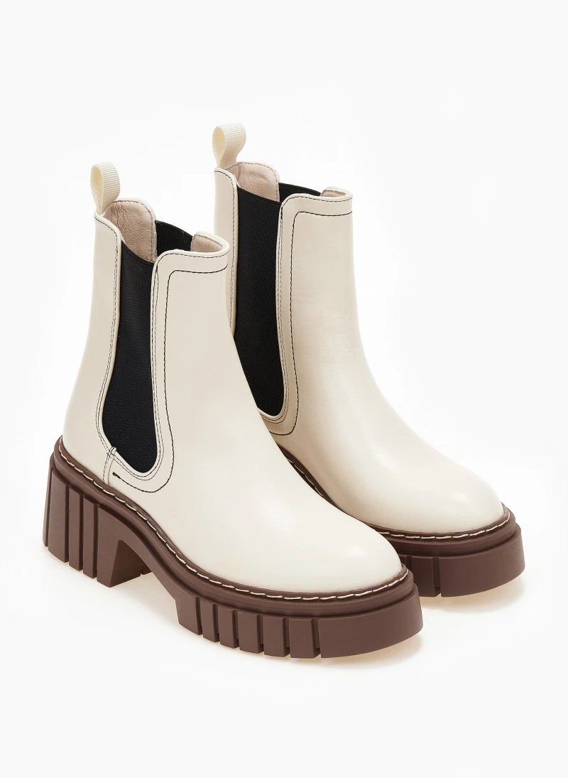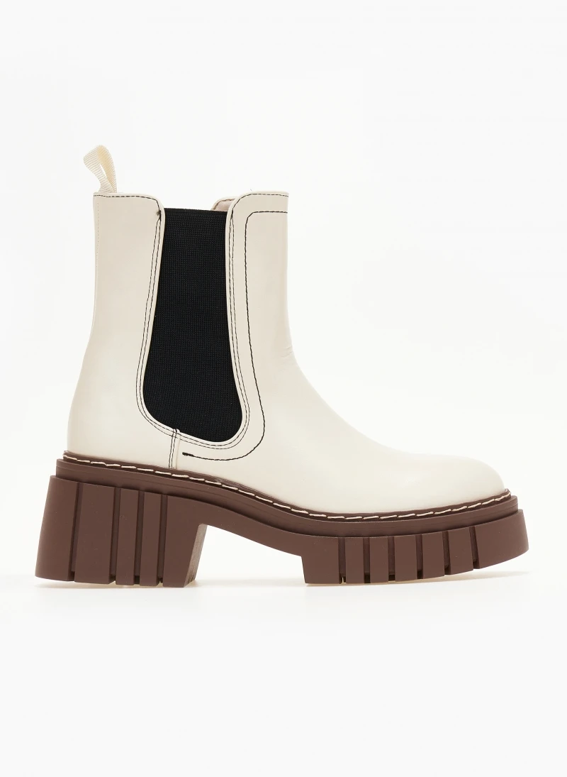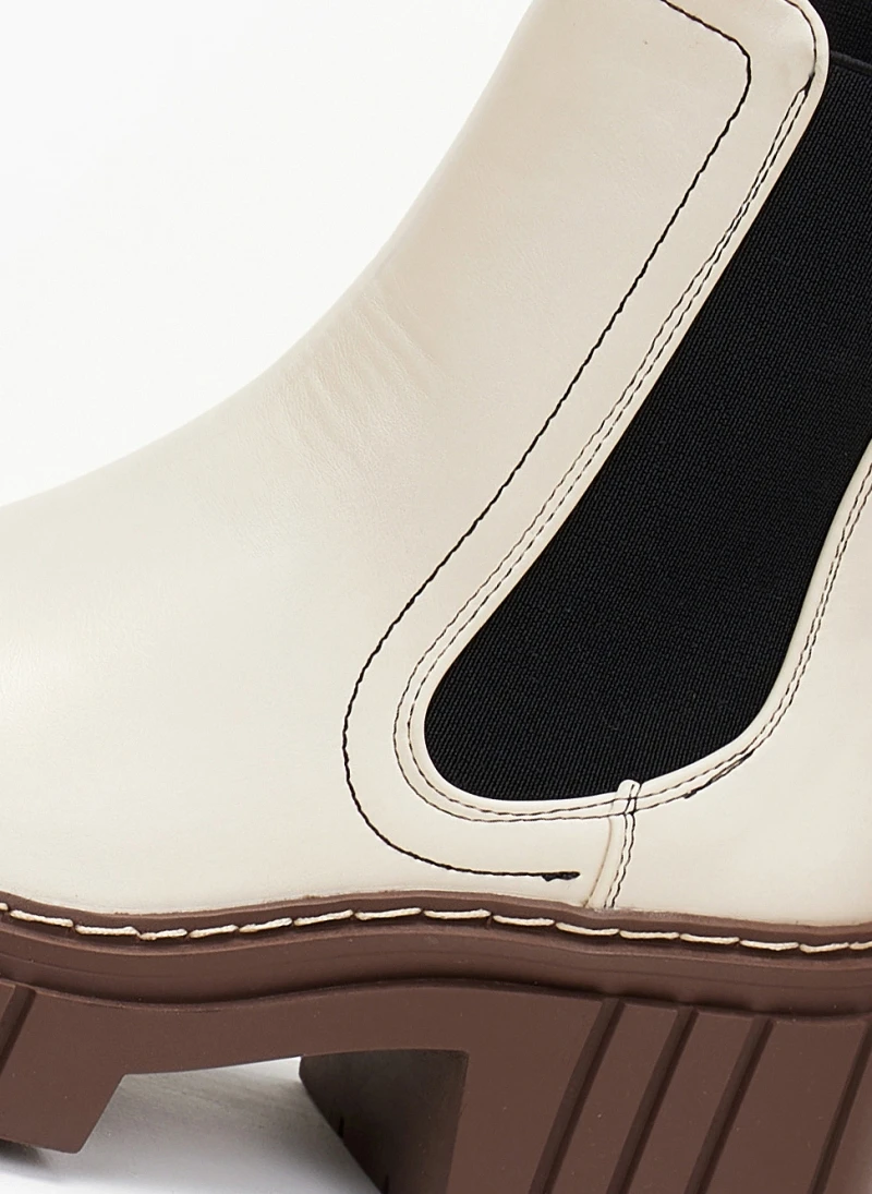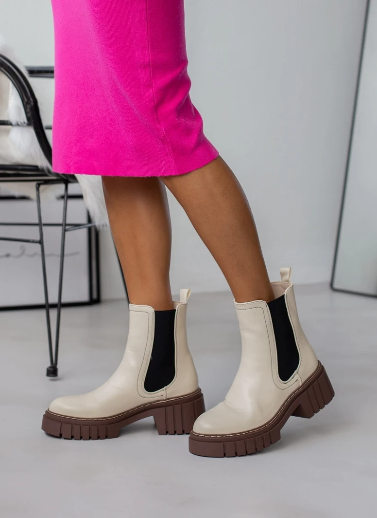 Chelsea μποτάκια με λάστιχο στο πλάι. Έχουν chunky ψηλή σόλα με ανάγλυφο σχέδιο. Εξωτερική ραφή στη σόλα. Στρογγυλή γραμμή.