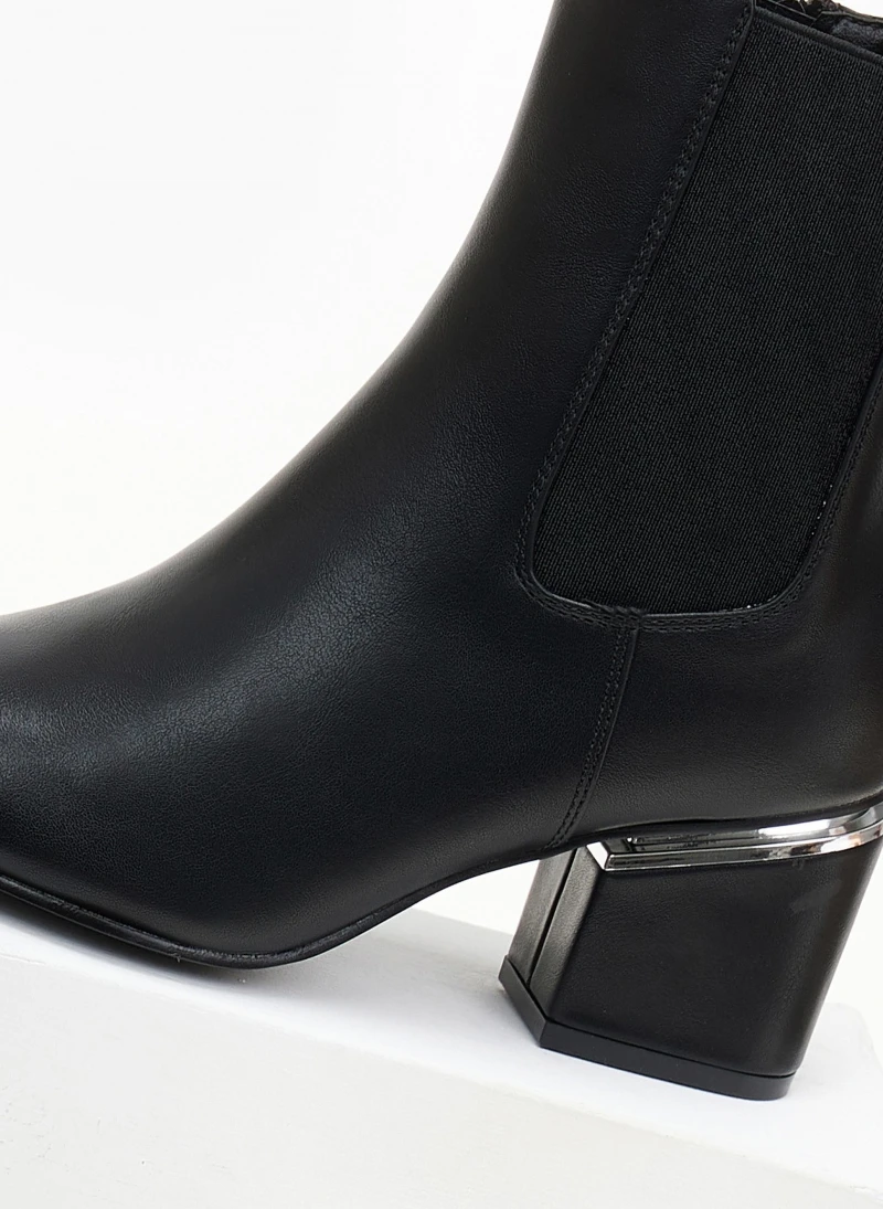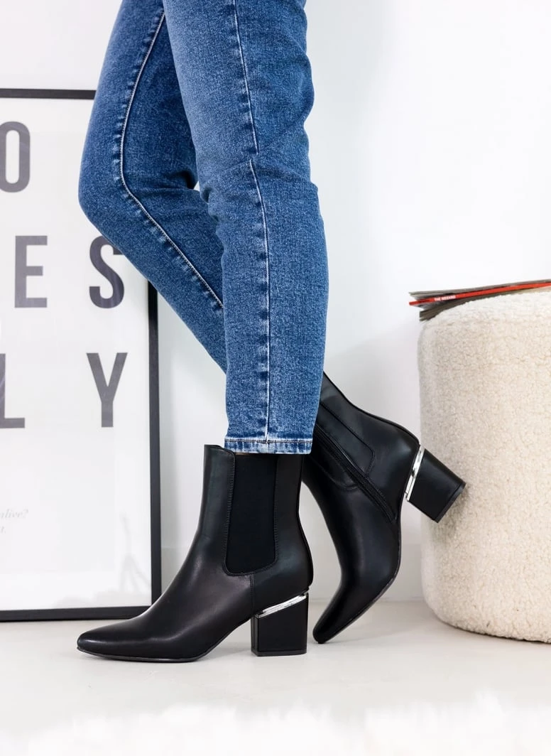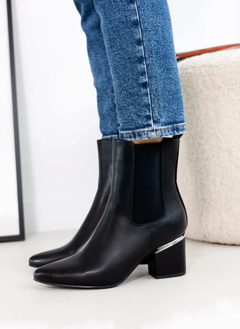 Μποτάκια μυτερά chelsea με χαμηλό χοντρό τακούνι. Έχουν λάστιχο στο πλάι. Διαθέτουν μεταλλική λεπτομέρεια στο τακούνι.