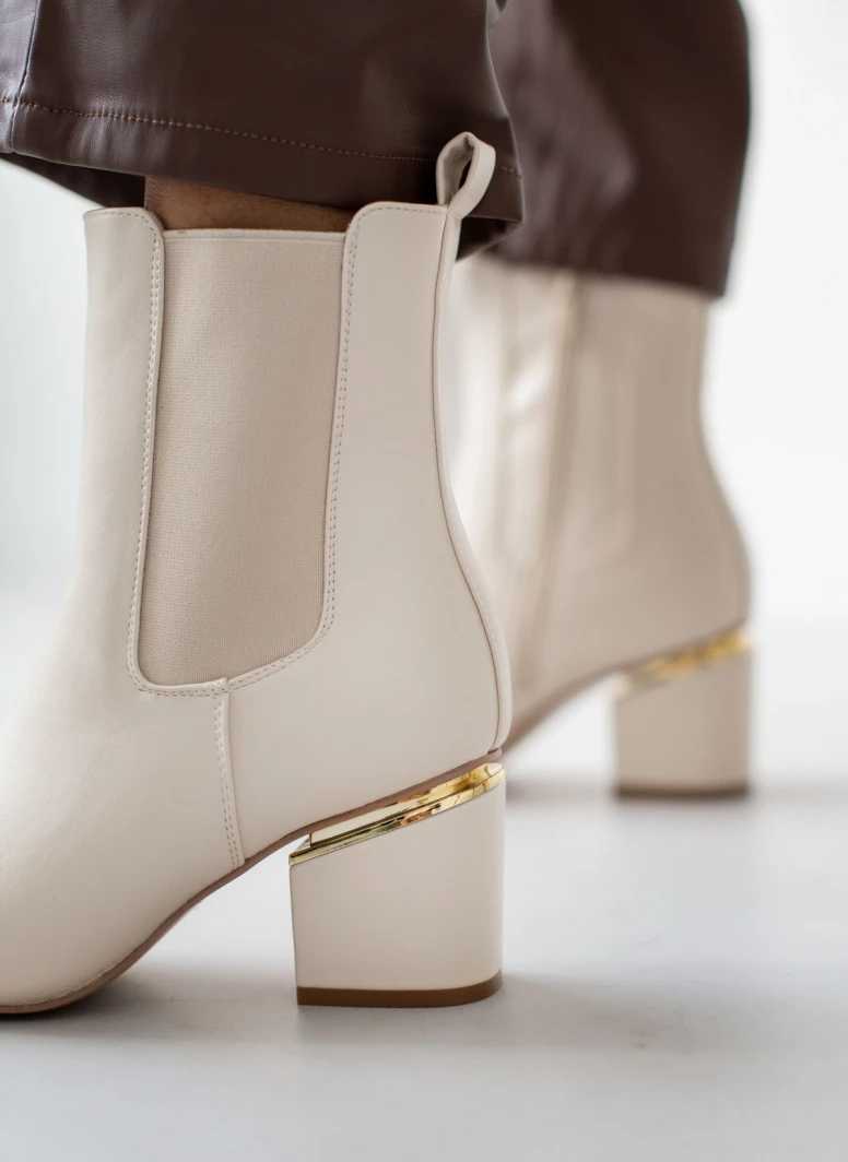 Μποτάκια μυτερά chelsea με χαμηλό χοντρό τακούνι. Έχουν λάστιχο στο πλάι. Διαθέτουν μεταλλική λεπτομέρεια στο τακούνι.