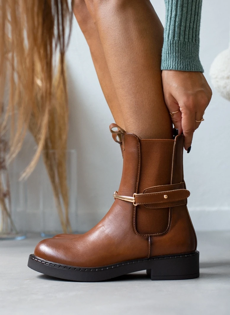 Μποτάκια φλατ με αποσπώμενο ζωνάκι και μεταλλικό διακοσμητικό στο ύψος του αστραγάλου. Έχουν λάστιχο στα πλαινά για καλύτερη εφαρμογή. Θηλάκια στο τελείωμα. Εφέ εξωτερική ραφή περιμετρικά της σόλας. Στρογγυλή γραμμή.