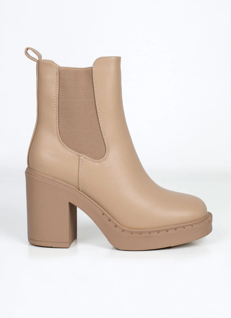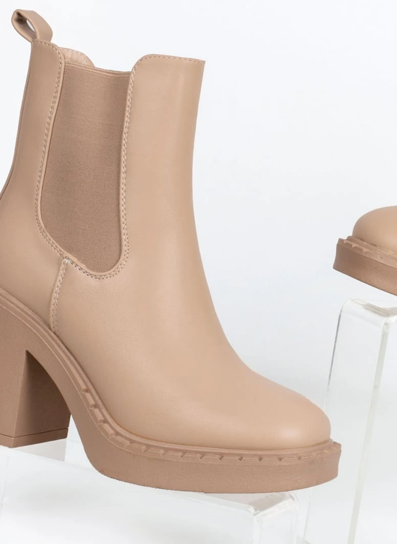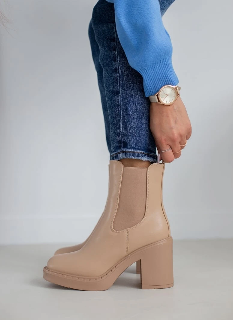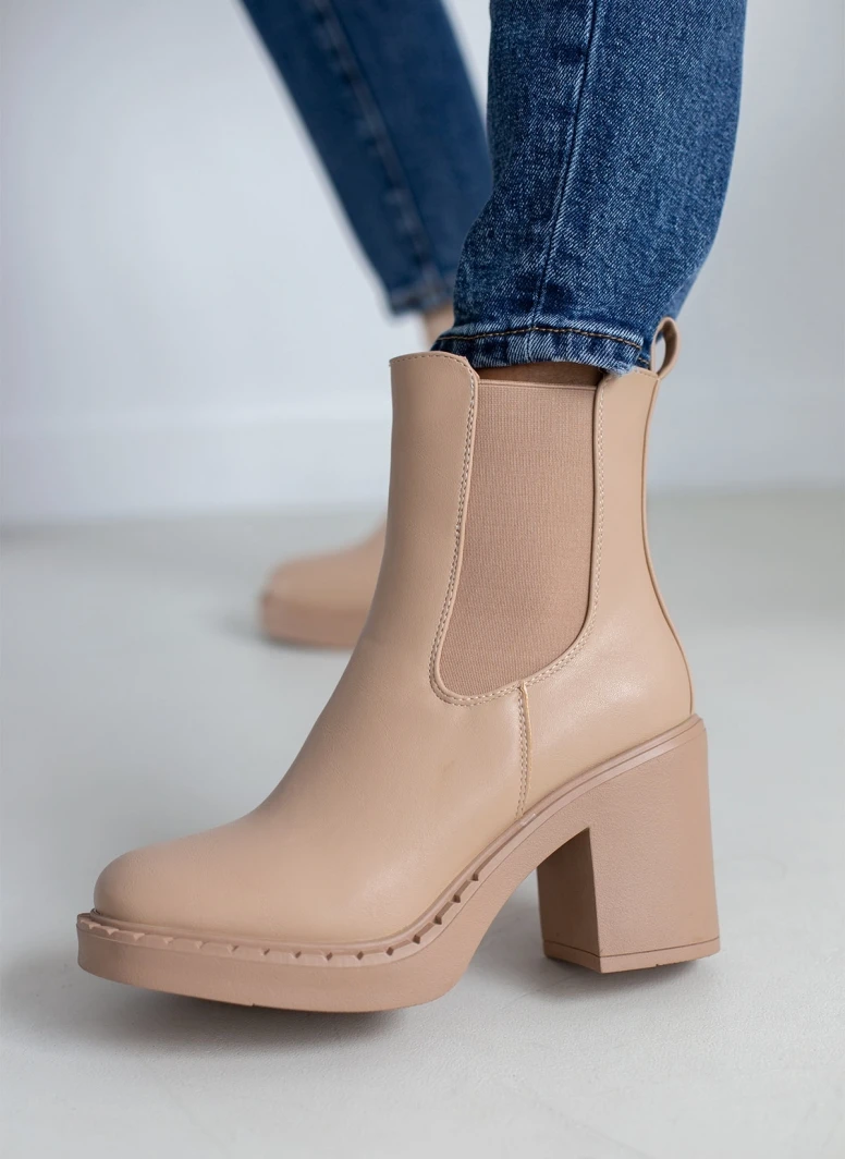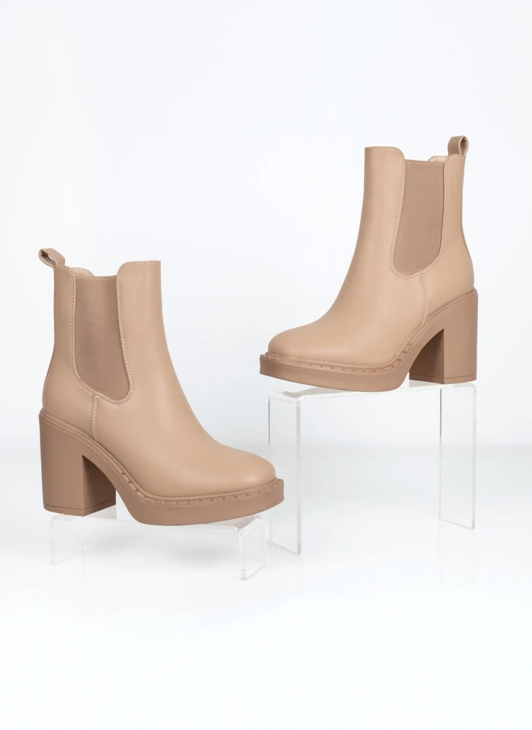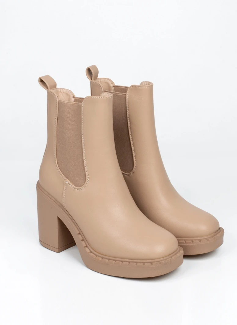 Μποτάκια chelsea με ψηλό χοντρό τακούνι. Έχουν θηλάκι στο πίσω μέρος. Ελαστικό τμήμα και στις δύο πλευρές. Στρογγυλή γραμμή.