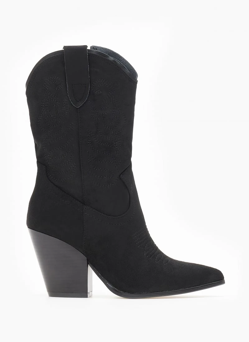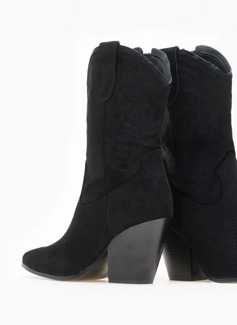 Μποτάκια cowboy suede. Έχουν σχέδιο με ραφές. Οβάλ τελείωμα με θηλάκι. Ξύλινο ψηλό τακούνι. Διαθέτουν ζεστή χνουδωτή επένδυση στο εσωτερικό τους. Λεπτομέρεια δερματίνη στο τελείωμα.