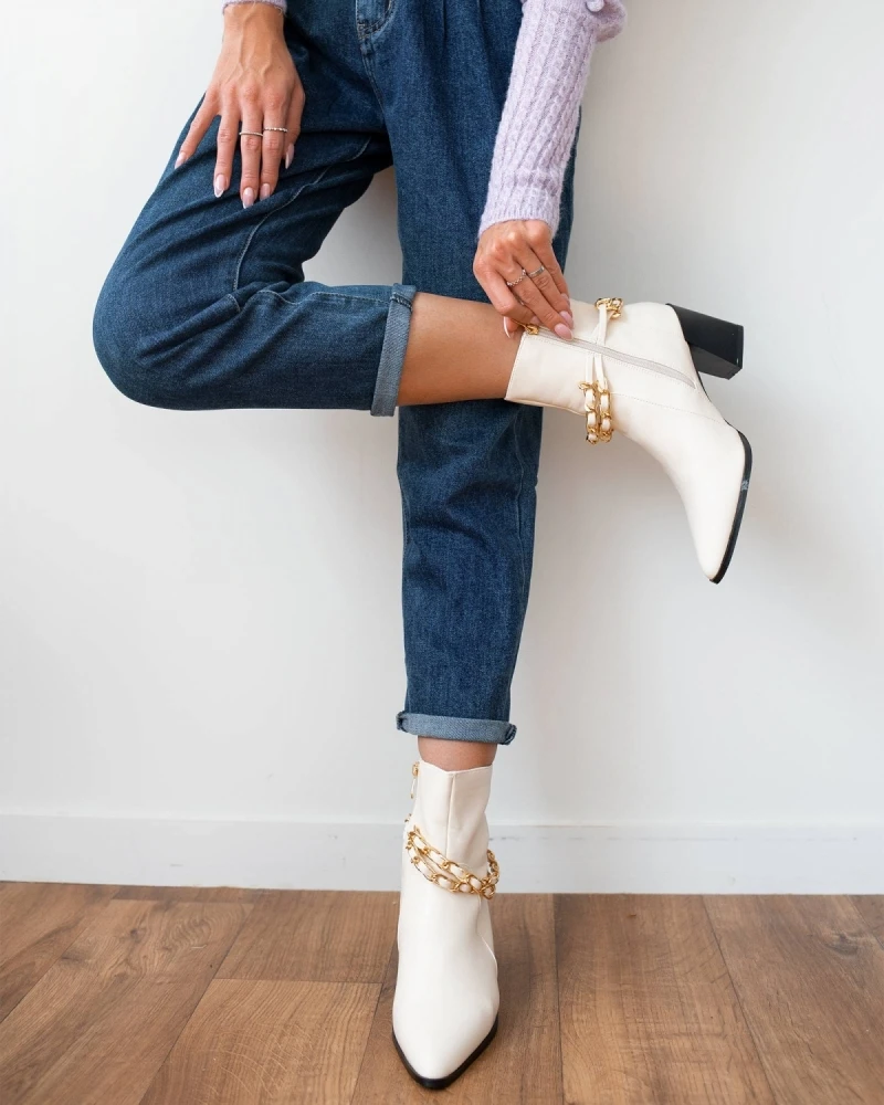 Μυτερά μποτάκια με ψηλό τετράγωνο τακούνι.Έχουν λουράκια χιαστί με αλυσίδα στο ύψος του αστραγάλου.