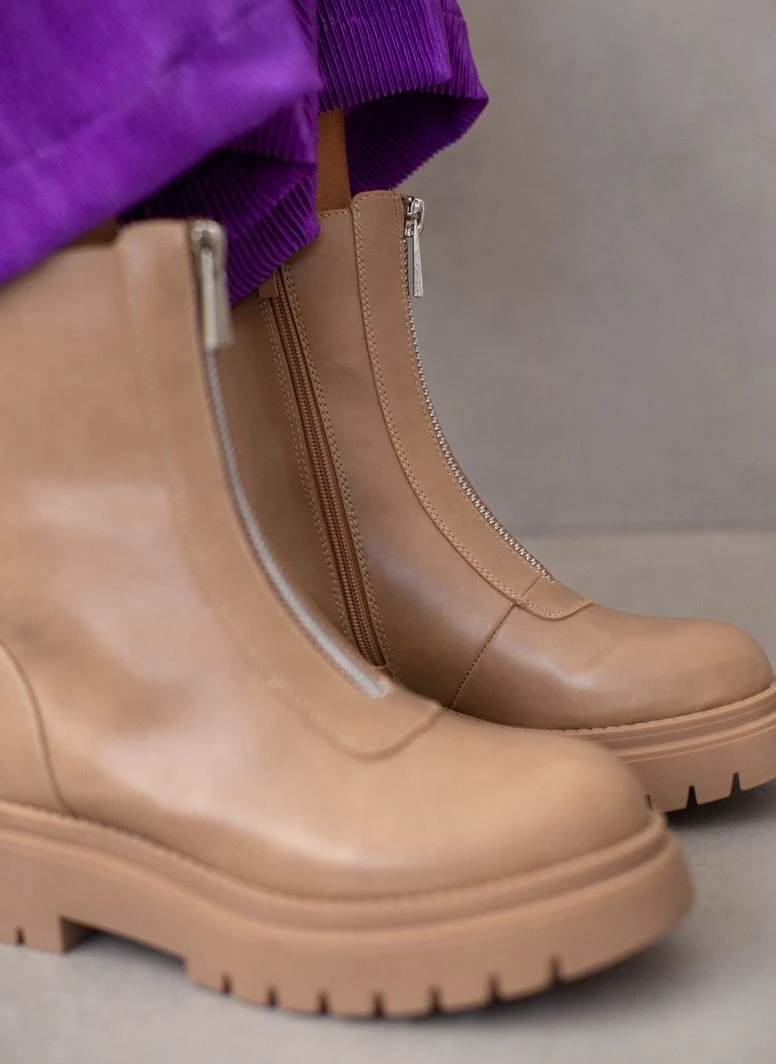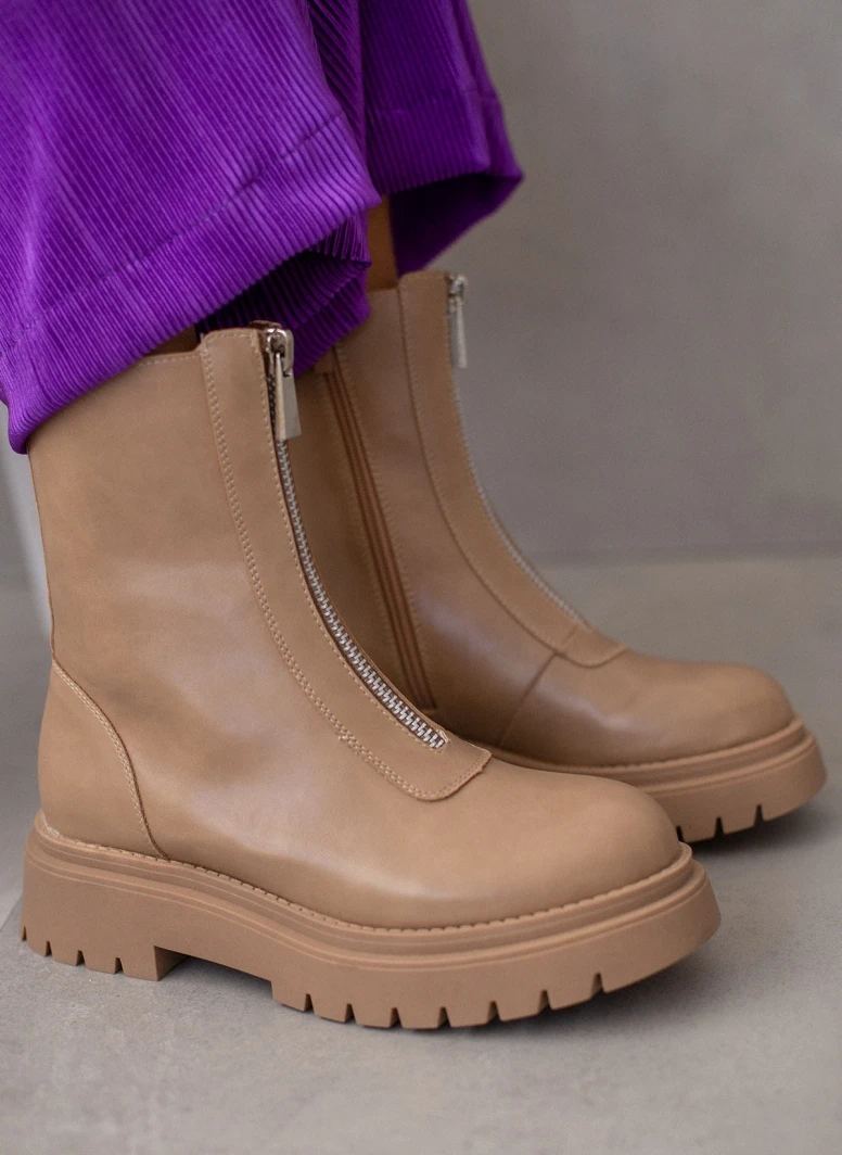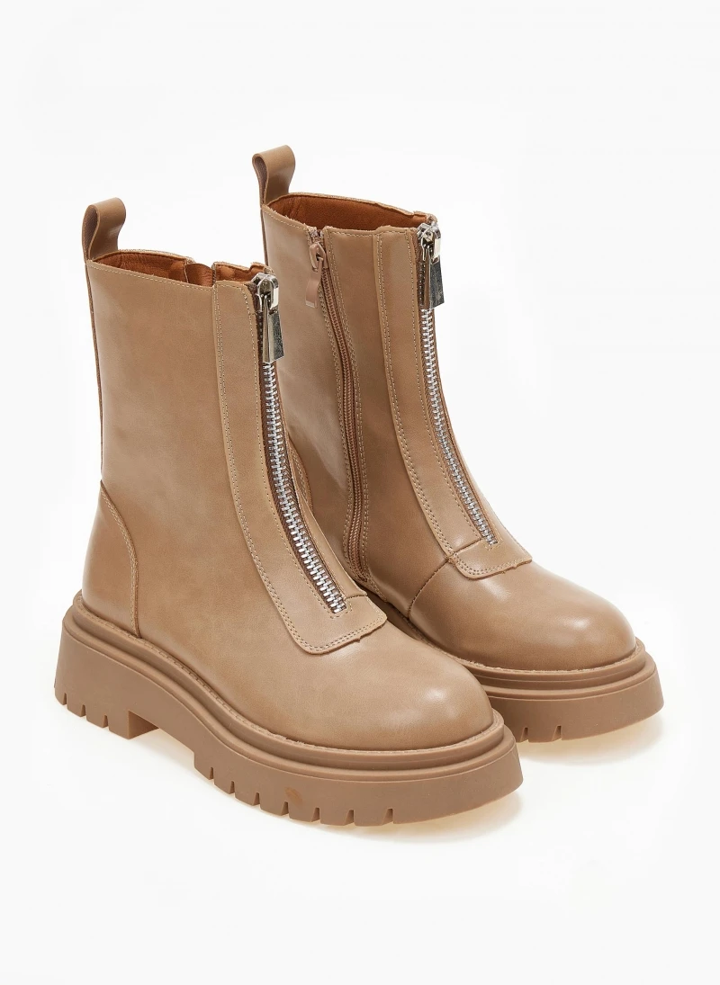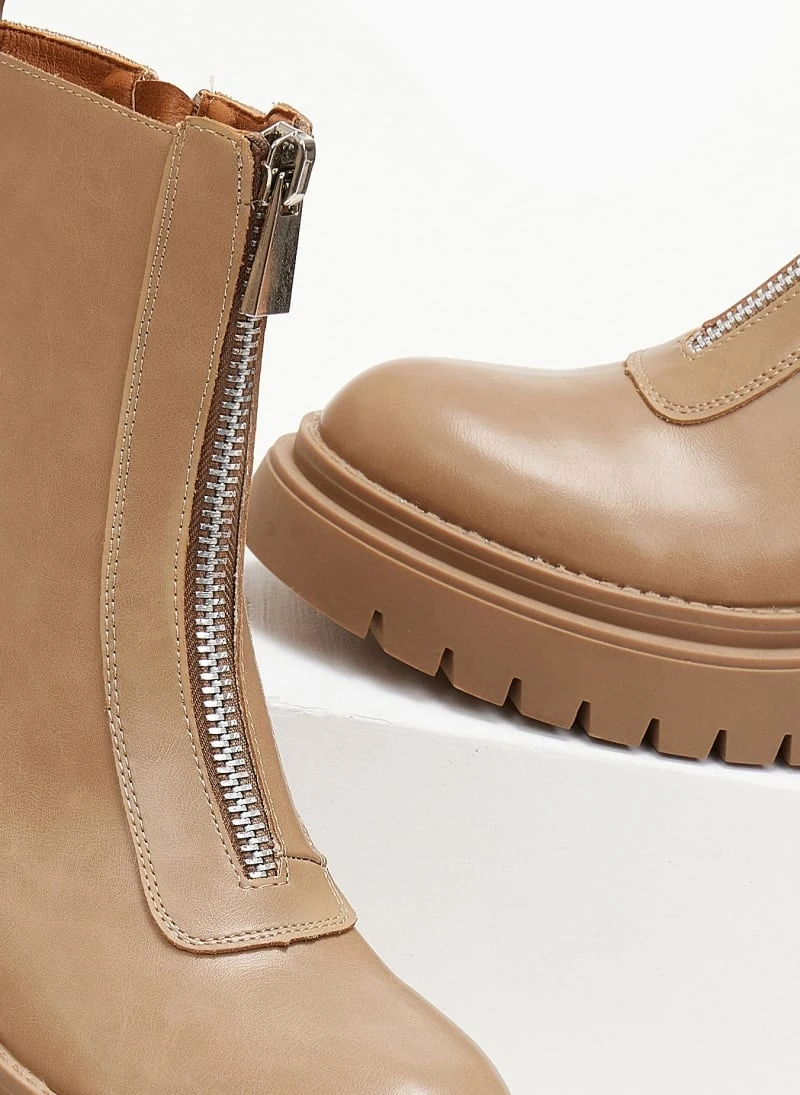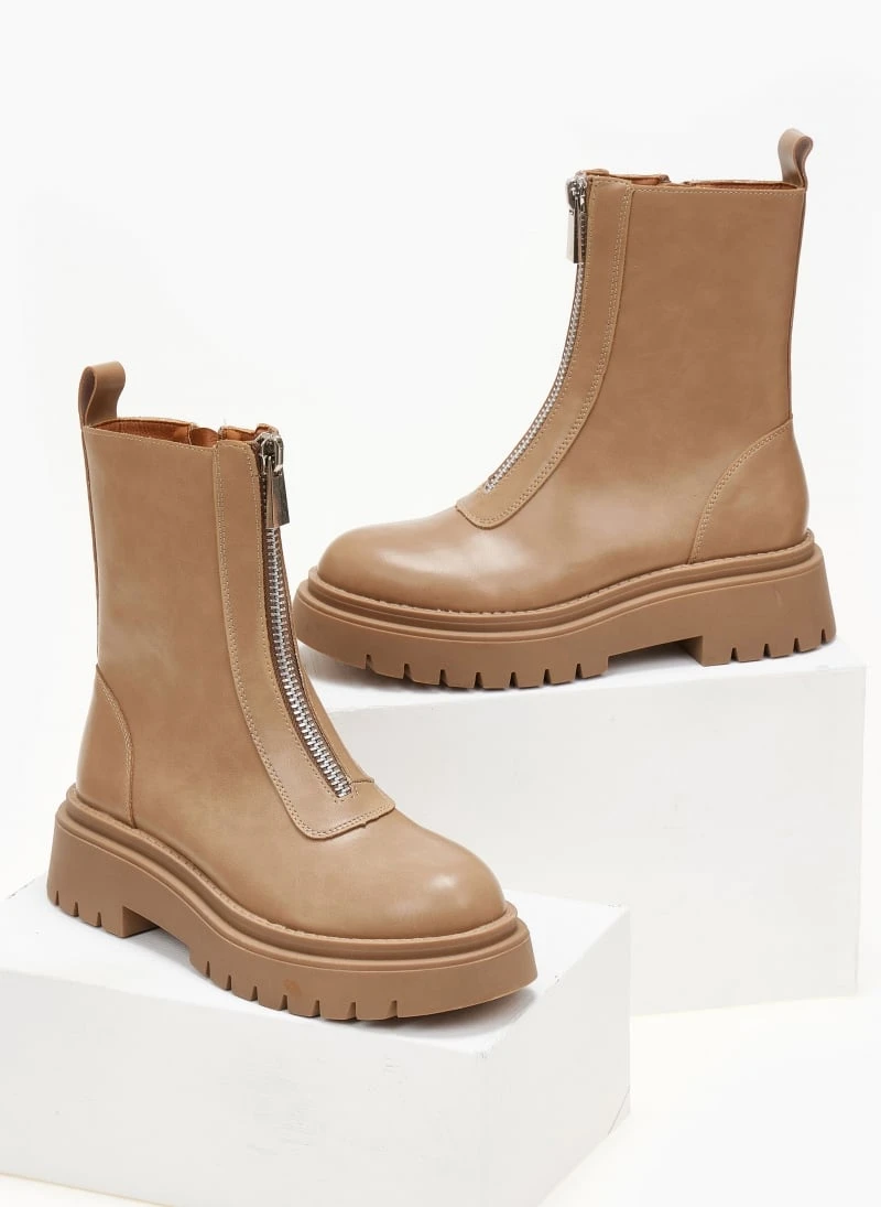 Μποτάκια με διακοσμητικό μεταλλικό φερμουάρ στη μπροστινή πλευρά. Θηλάκι στο τελείωμα. Τρακτερωτή σόλα. Στρογγυλή γραμμή.