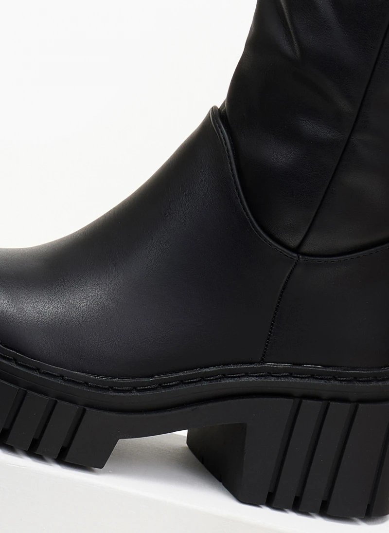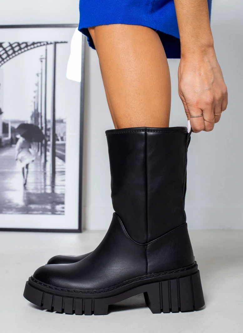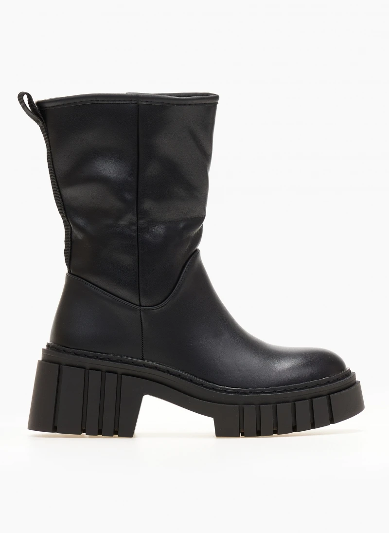 Μποτάκια με ψηλή chunky σόλα. Υφασμάτινη λεπτομέρεια με θηλάκι στο πίσω μέρος. Έχουν επένδυση από οικολογικό sheepskin στο εσωτερικό τους. Εξωτερική ραφή περιμετρικά της σόλας.