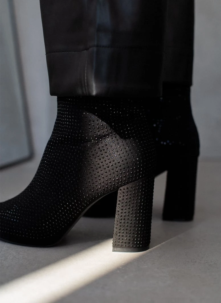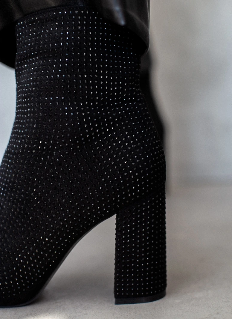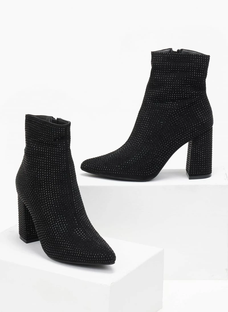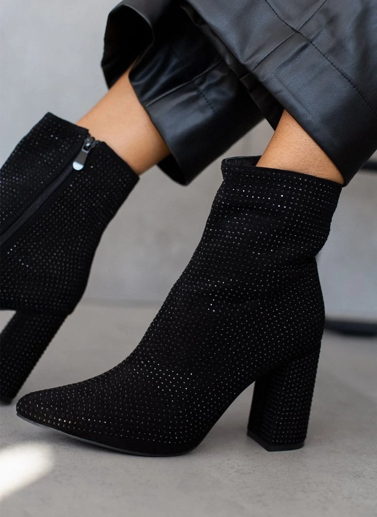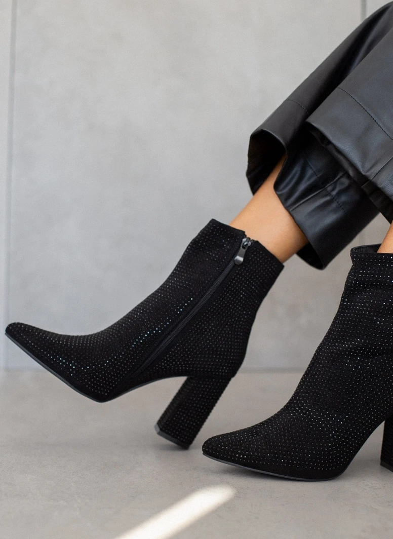 Μποτάκια μυτερά με strass. Έχουν ψηλό χοντρό τακούνι.