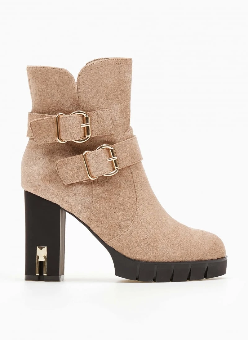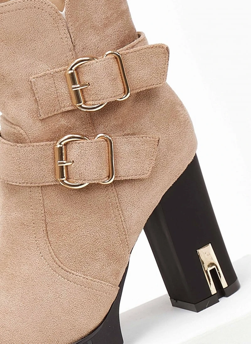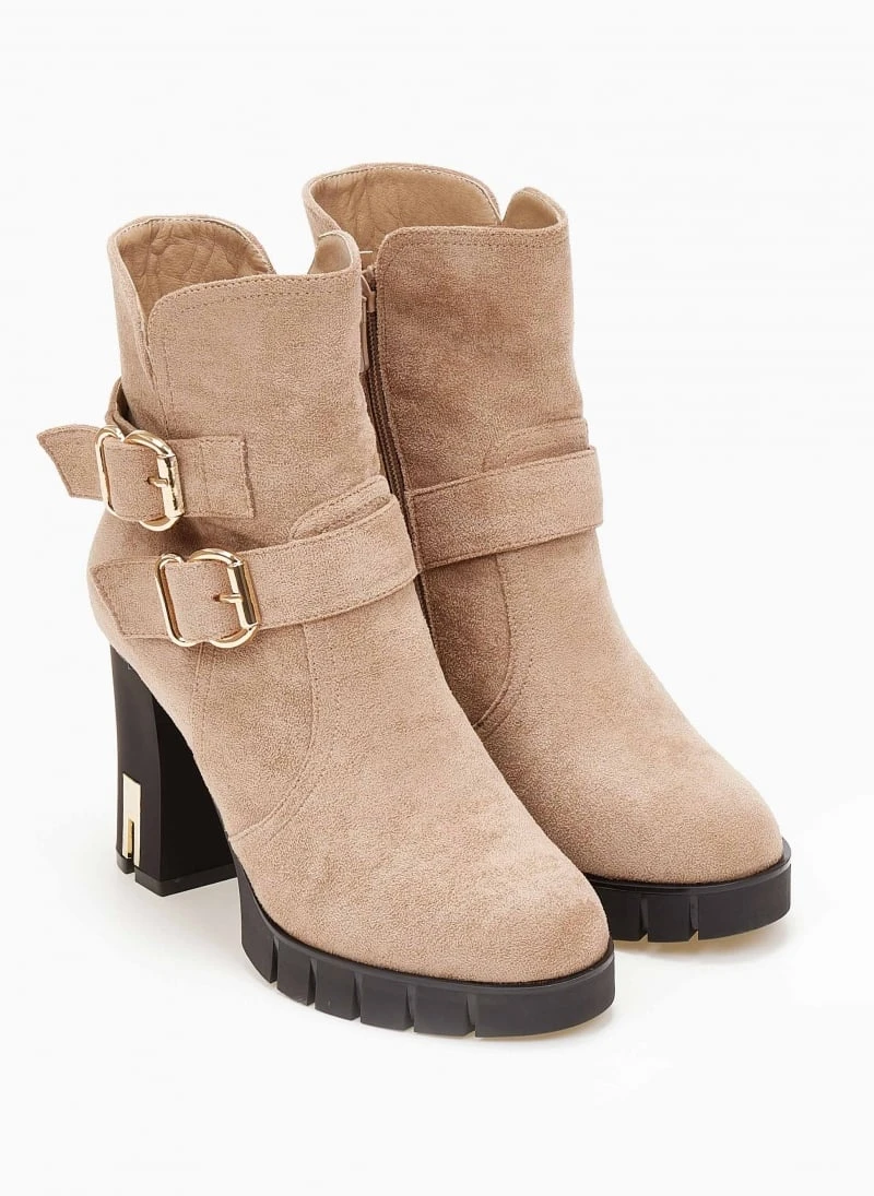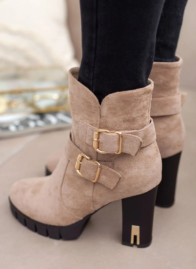 Μποτάκια suede με διπλή αγκράφα στο πλάι. Έχουν ψηλό χοντρό τακούνι με μεταλλική λεπτομέρεια. Στρογγυλή γραμμή. Σόλα με σχέδιο.