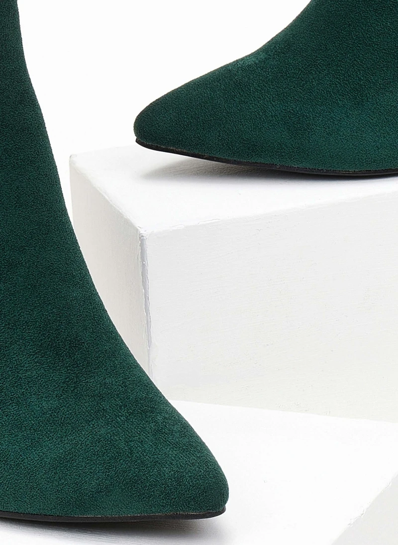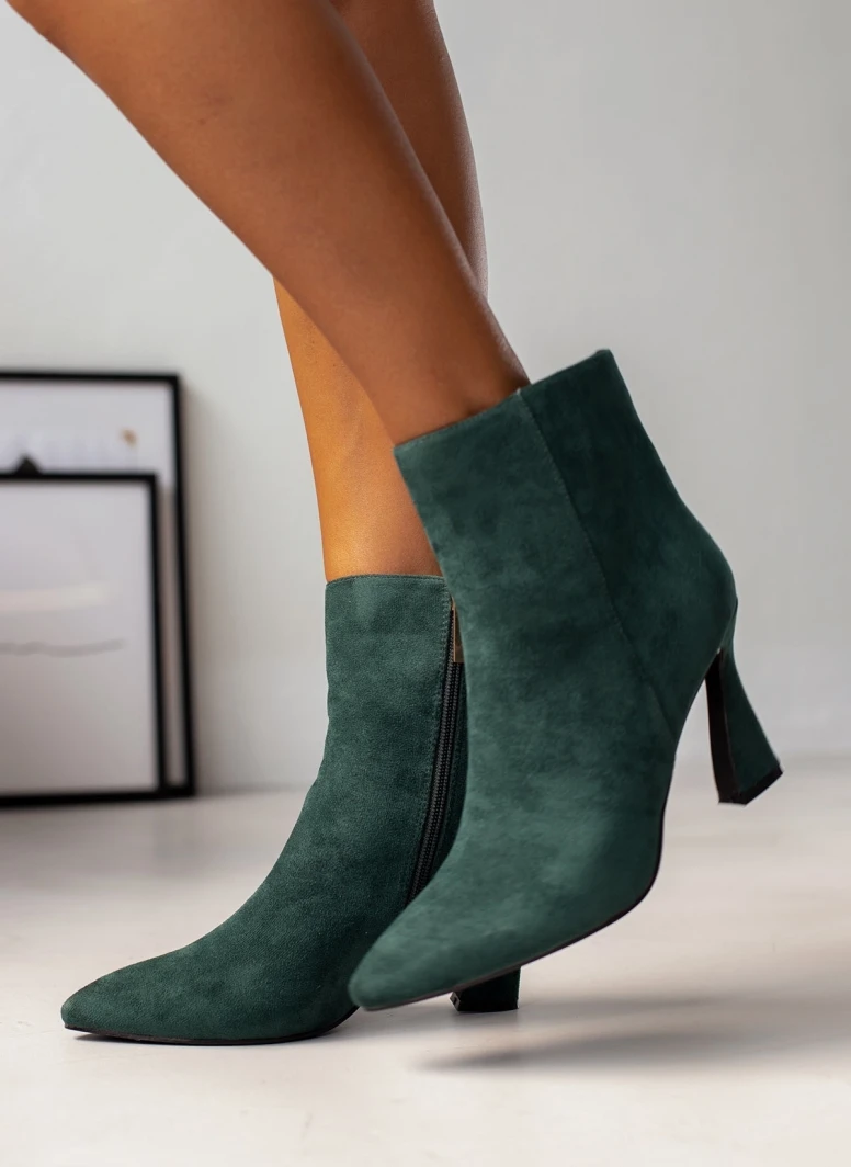Μποτάκια suede με τακούνι καμπάνα. Έχουν κάθετη ραφή στο πλάι. Μυτερή φόρμα.