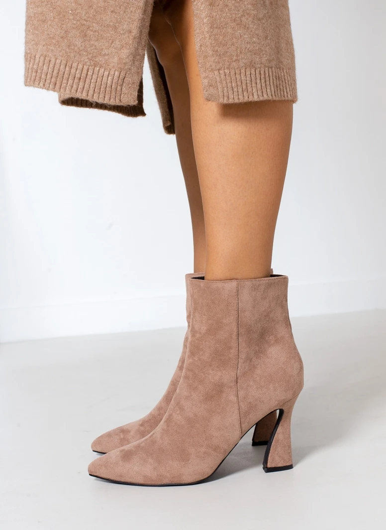 Μποτάκια suede με τακούνι καμπάνα. Έχουν κάθετη ραφή στο πλάι. Μυτερή φόρμα.