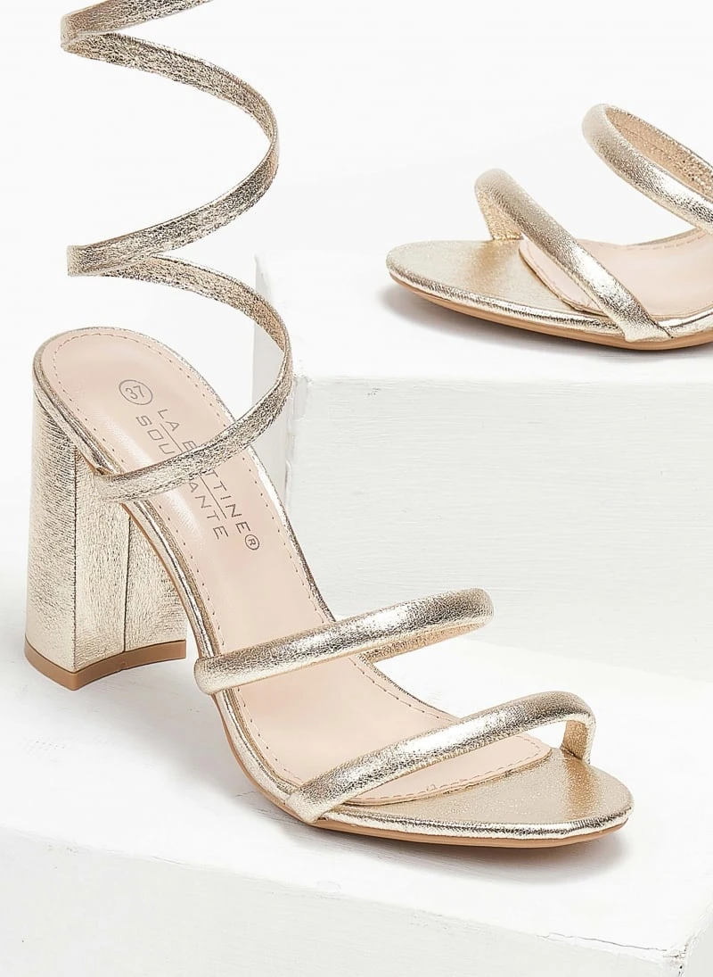 Πέδιλα με λεπτά λουράκια. Έχουν έλασμα στη γάμπα. Ψηλό χοντρό τακούνι.