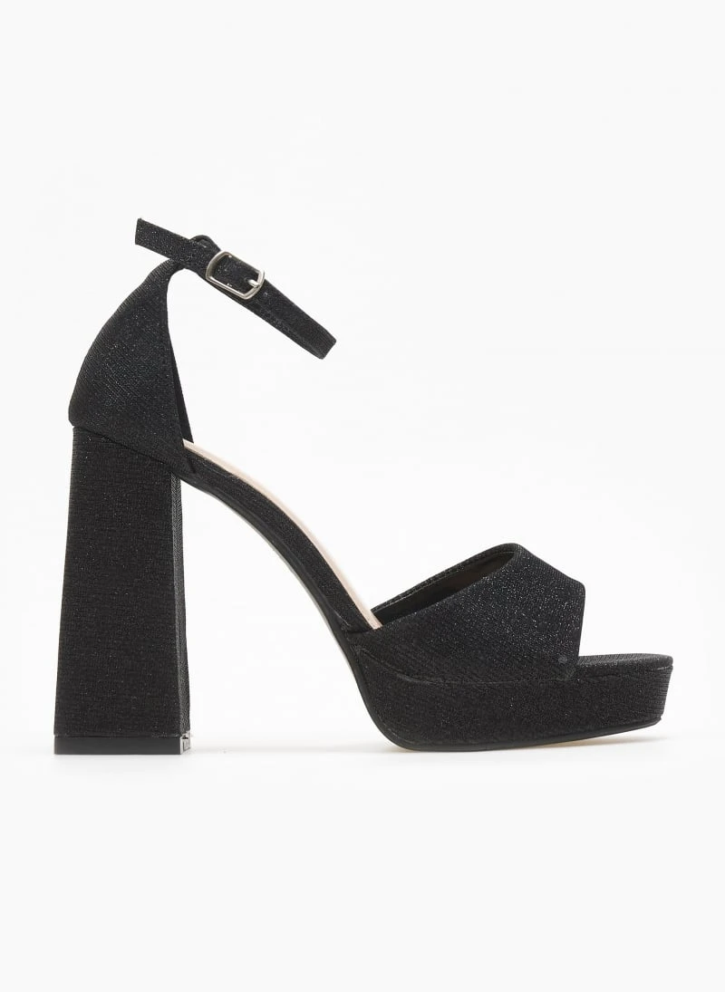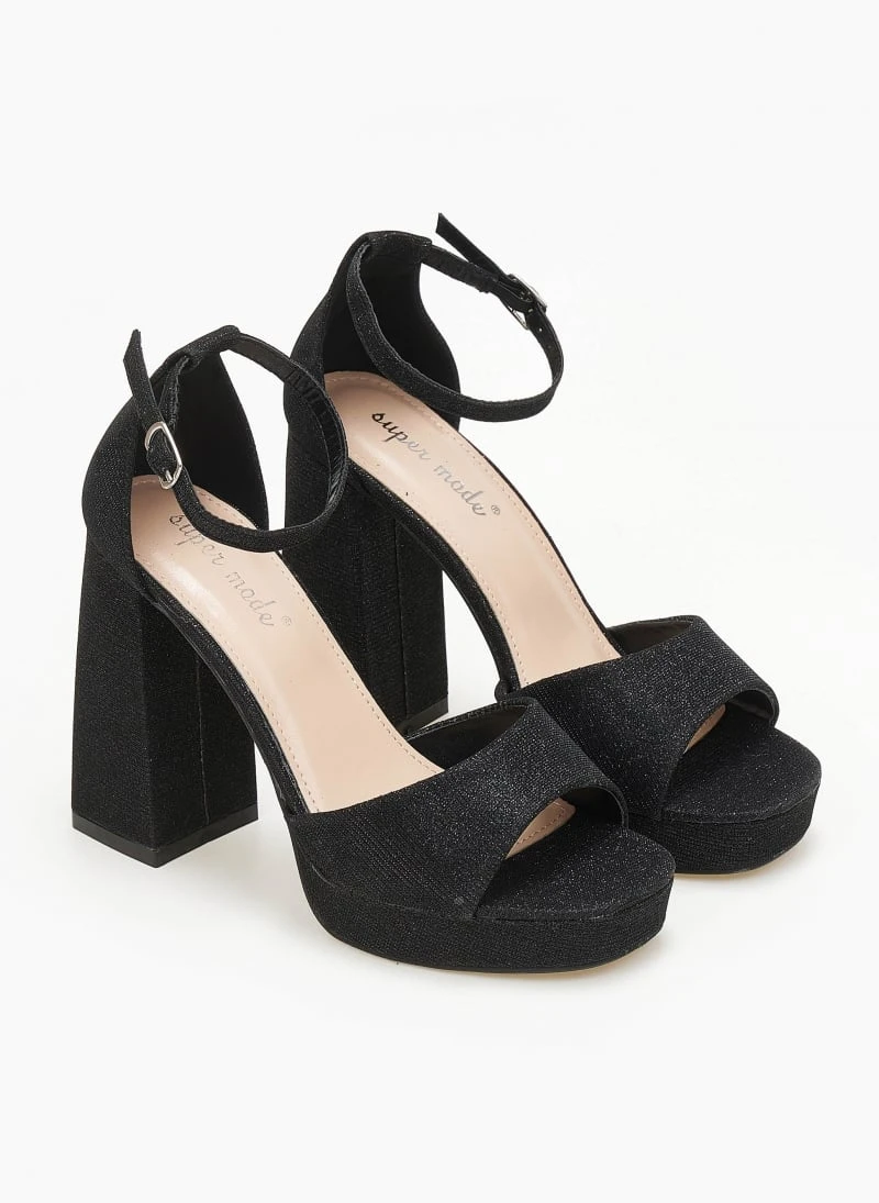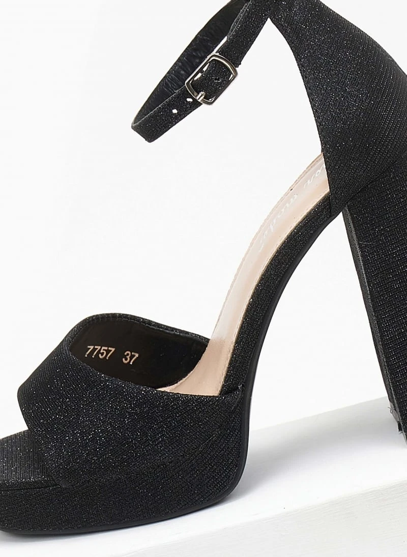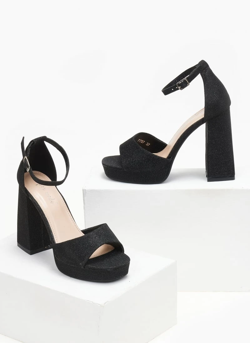 Πέδιλα από ύφασμα glitter. Έχουν κλειστή φτέρνα. Δένουν με μπαρέτα στο ύψος του αστραγάλου. Ψηλό χοντρό τακούνι.