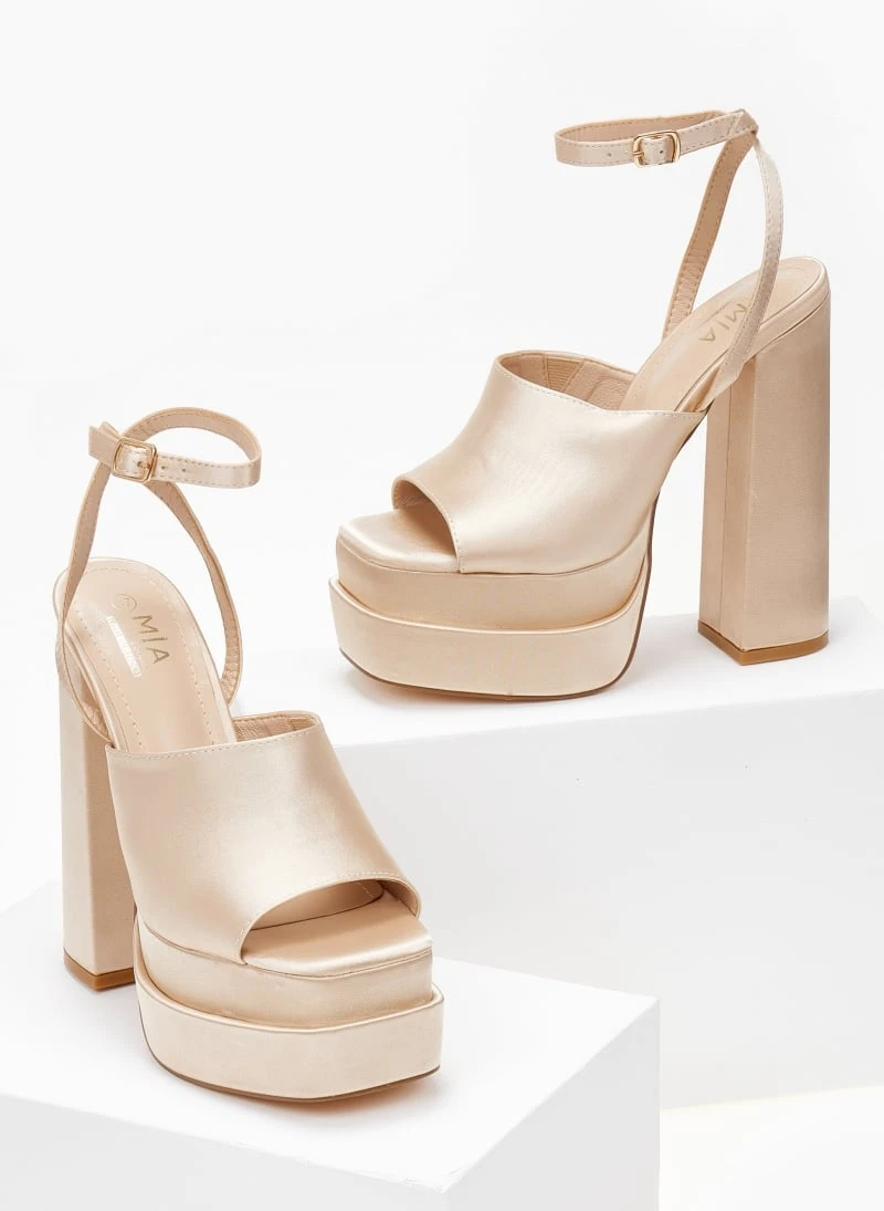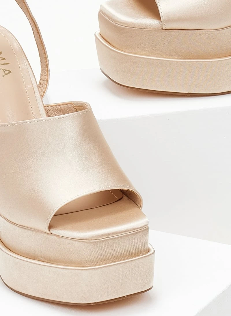 Πέδιλα platform σατέν με ψηλή φιάπα και χοντρό τακούνι. Έχουν φαρδιά χωστή φάσα. Δένουν με μπαρέτα στο ύψος του αστραγάλου.