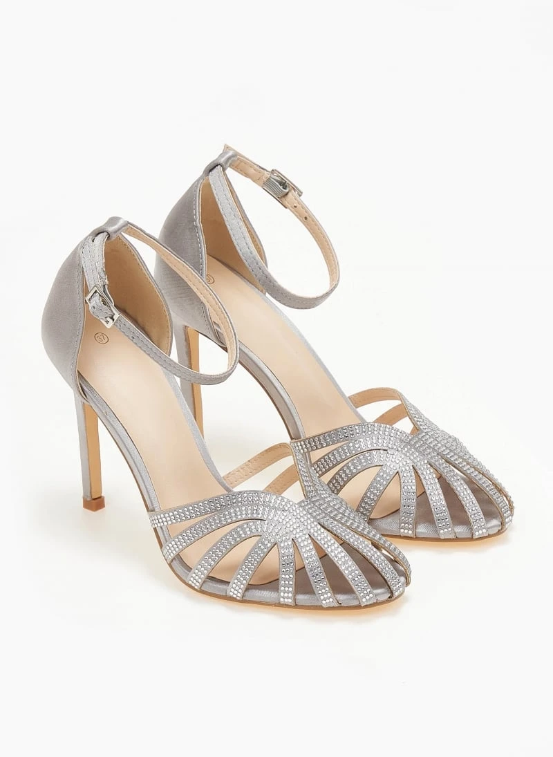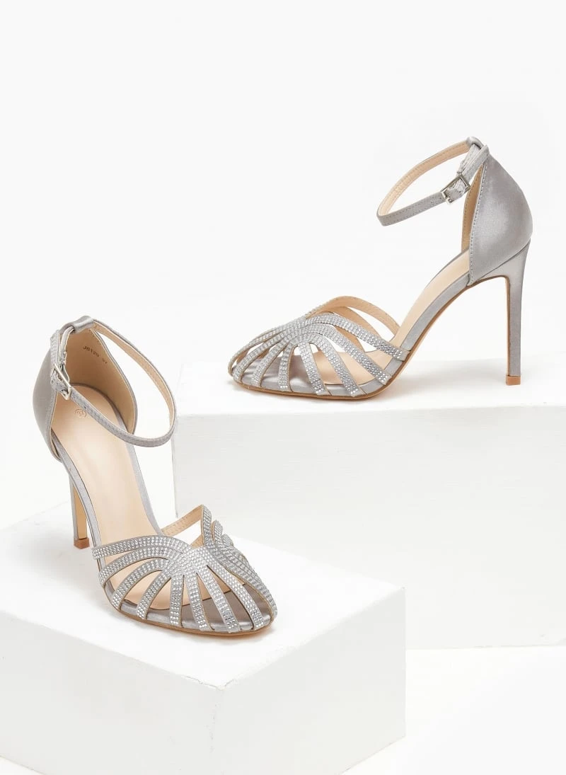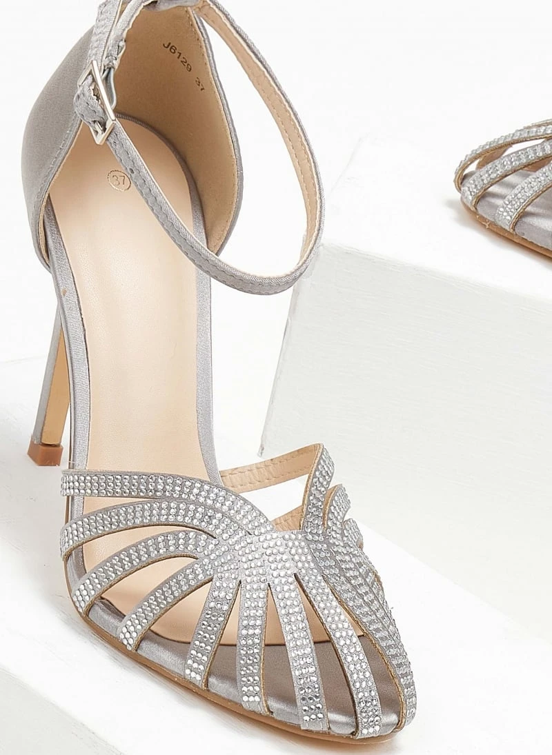 Πέδιλα σατέν σε ρετρό σχέδιο με strass. Έχουν κλειστή φτέρνα. Δένουν με μπαρέτα στο ύψος του αστραγάλοτ. Ψηλό λεπτό τακούνι.