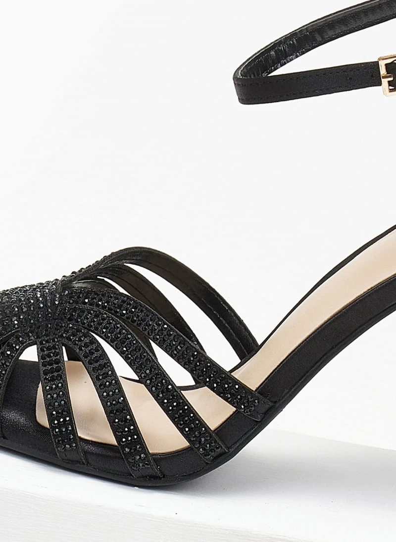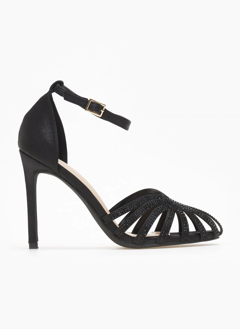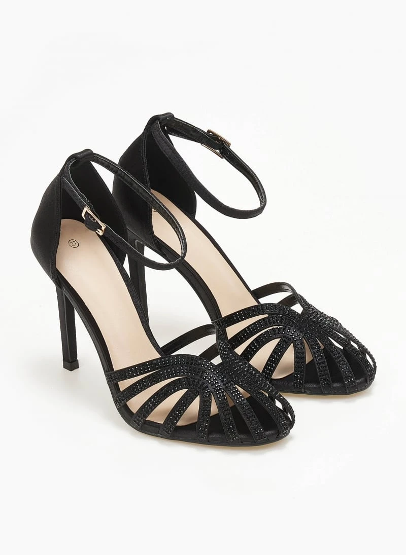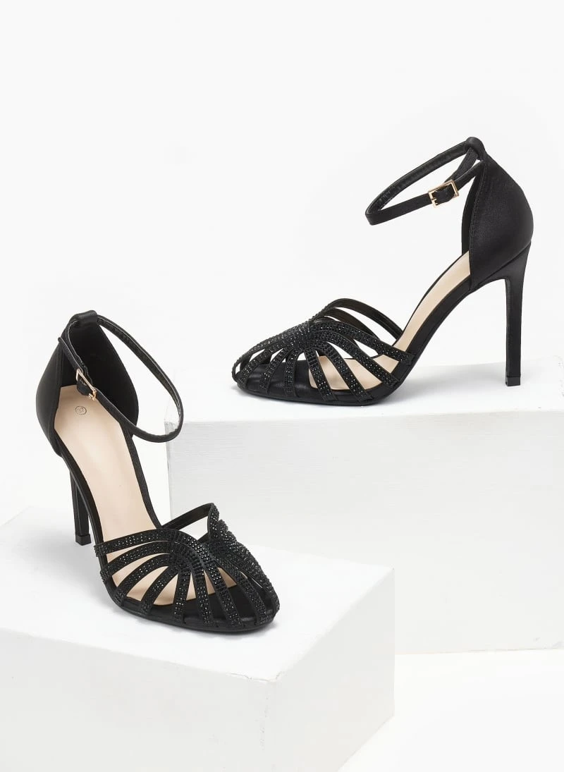 Πέδιλα σατέν σε ρετρό σχέδιο με strass. Έχουν κλειστή φτέρνα. Δένουν με μπαρέτα στο ύψος του αστραγάλοτ. Ψηλό λεπτό τακούνι.