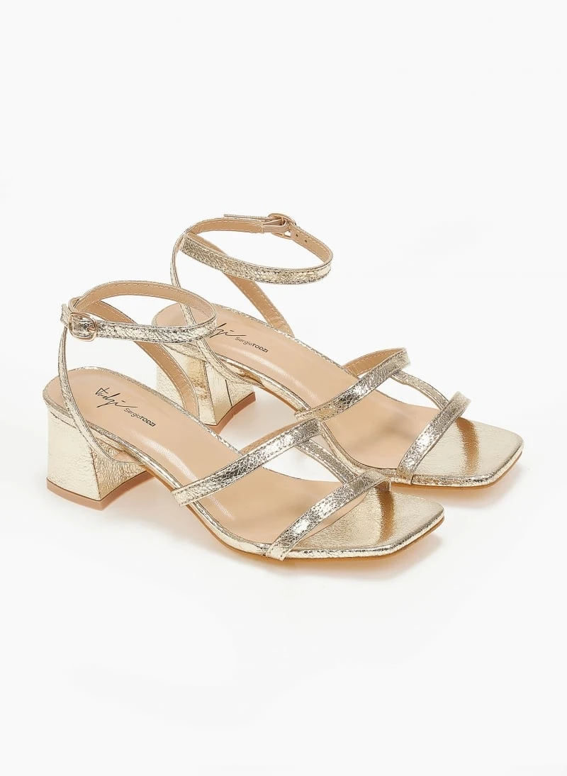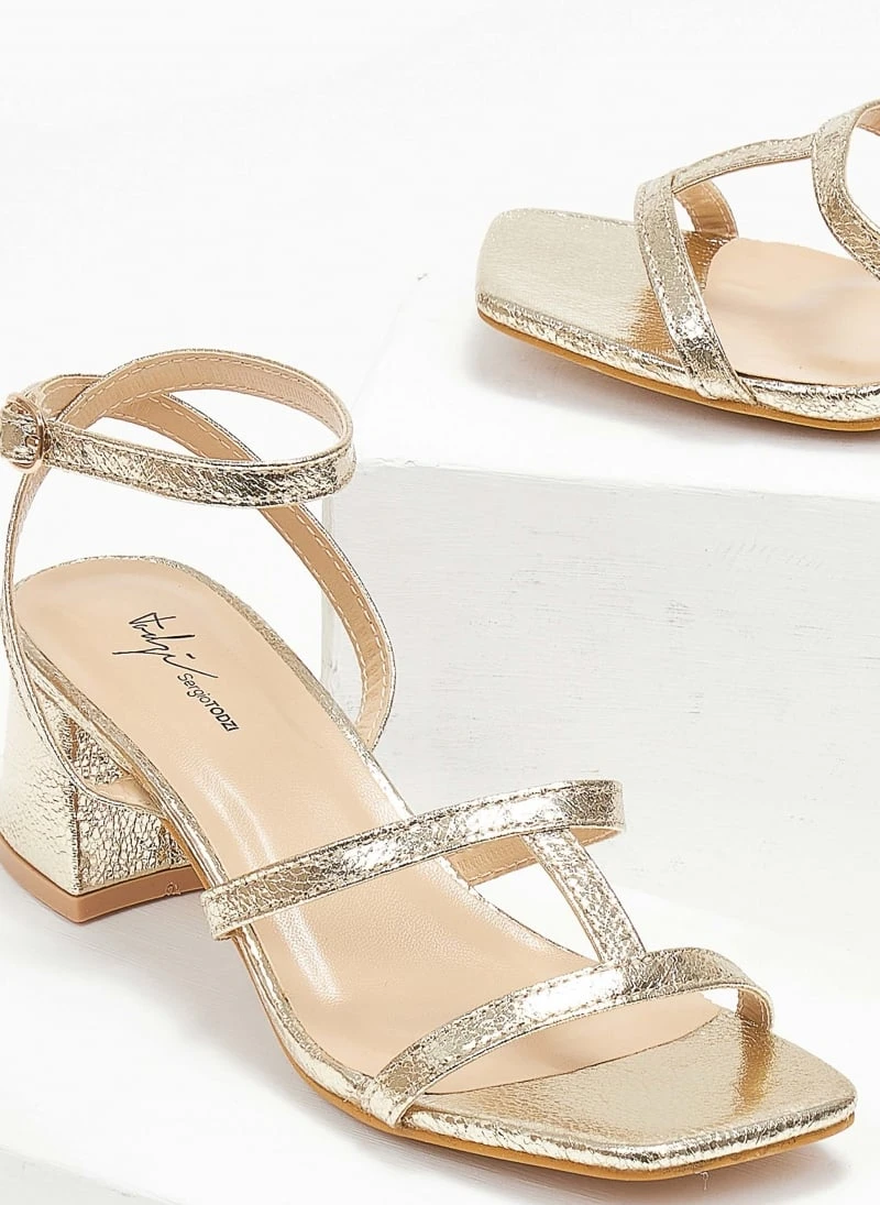 Πέδιλα με λεπτά λουράκια. Δένουν με μπαρέτα στο ύψος του αστραγάλου. Τετράγωνο χαμηλό τακούνι. Καρέ γραμμή.