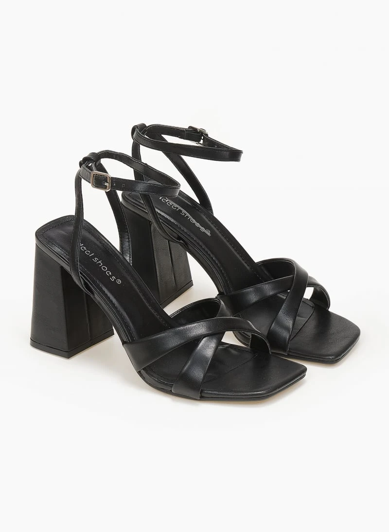 Πέδιλα σε καρέ γραμμή. Έχουν σχέδιο χιαστί λουράκια. Δένουν με μπαρέτα στο ύψος του αστραγάλου.