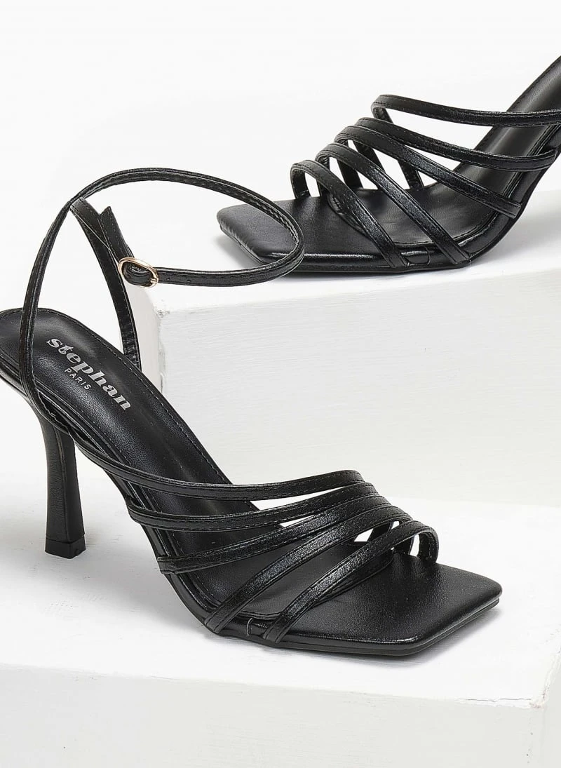 Πέδιλα σε καρέ γραμμή με λεπτά λουράκια. Δένουν με μπαρέτα στο ύψος του αστραγάλου.