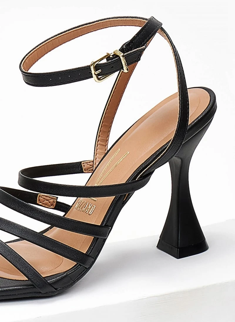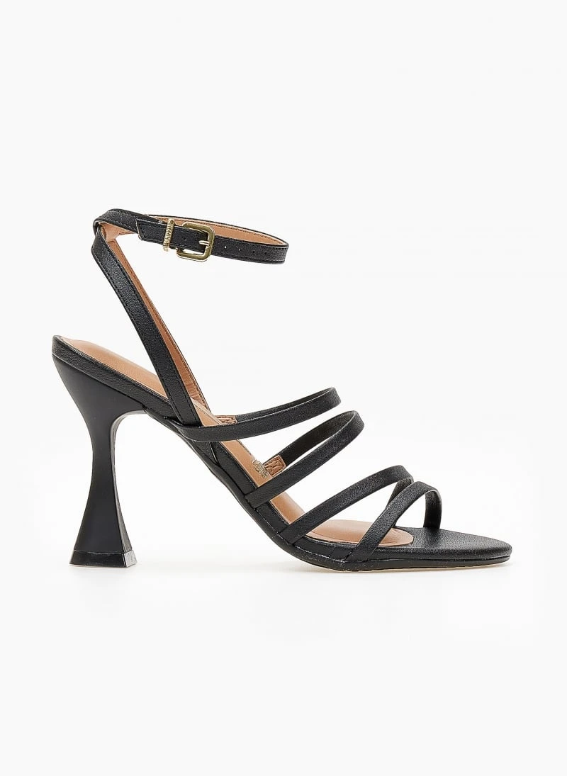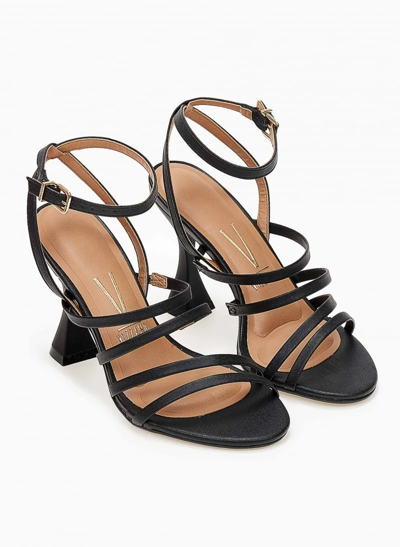 Πέδιλα VIZZANO με ιδιαίτερο σχήμα στο τακούνι. Έχουν λεπτά λουράκια. Δένουν με μπαρέτα στο ύψος του αστραγάλου.