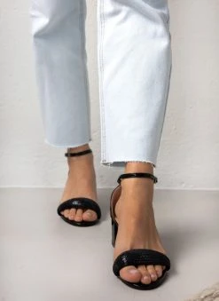 Πέδιλα με έντονο strass στη φάσα. Έχουν κλειστή φτέρνα. Δένουν με μπαρέτα στο ύψος του αστραγάλου. Χαμηλό χοντρό τακούνι.