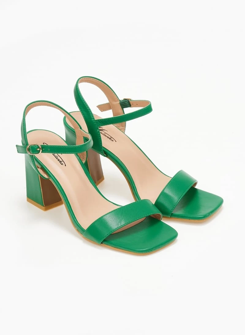 Πέδιλα μονόχρωμα με ψηλό τετράγωνο τακούνι. Δένουν με μπαρέτα ψηλά στο κουτεπιέ. Καρέ γραμμή.