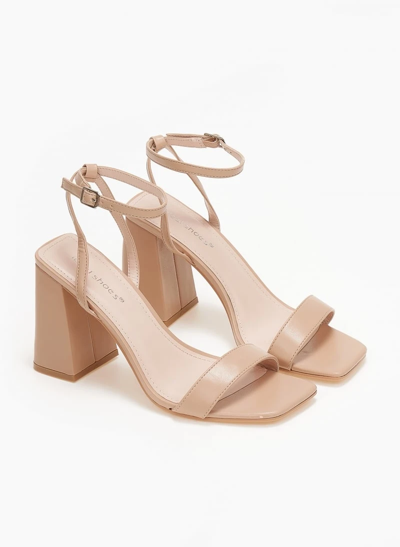 Πέδιλα με ψηλό χοντρό τακούνι. Δένουν με μπαρέτα στο ύψος του αστραγάλου. Καρέ γραμμή.