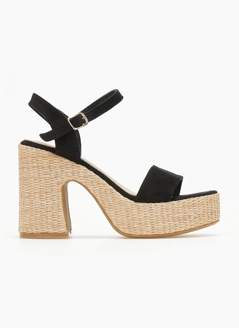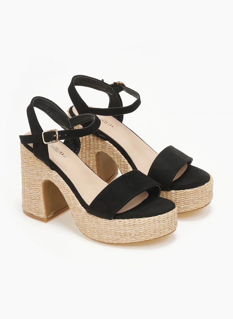 Πέδιλα suede με ψάθινη σόλα και τακούνι. Δένουν με μπαρέτα στο ύψος του αστραγάλου.